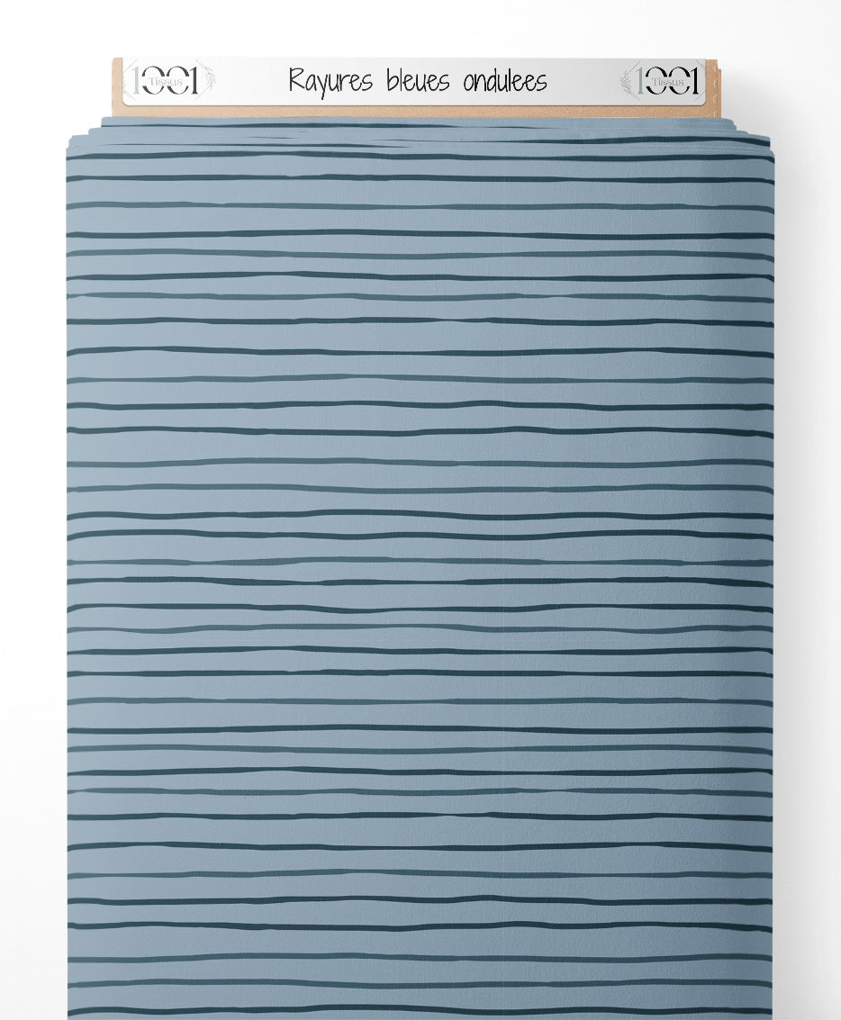 Les rayures ondulées varient légèrement en épaisseur. Le fond bleu clair crée un contraste doux avec les rayures.Les tissus