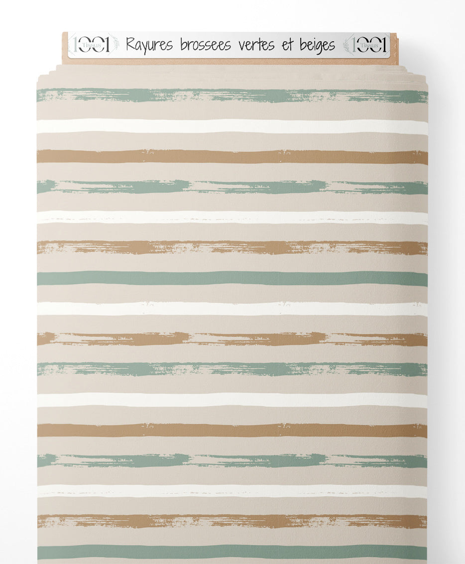 Les rayures vertes sont accompagnées de nuances de beige et de blanc. Chaque rayure présente une texture légèrement brossée. Les couleurs se répètent de manière harmonieuse sur toute la surface.Les tissus