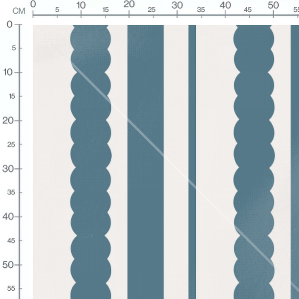 Les rayures sont larges et alternent avec des vagues arrondies. Le bleu est doux et contraste avec le fond blanc.Les tissus