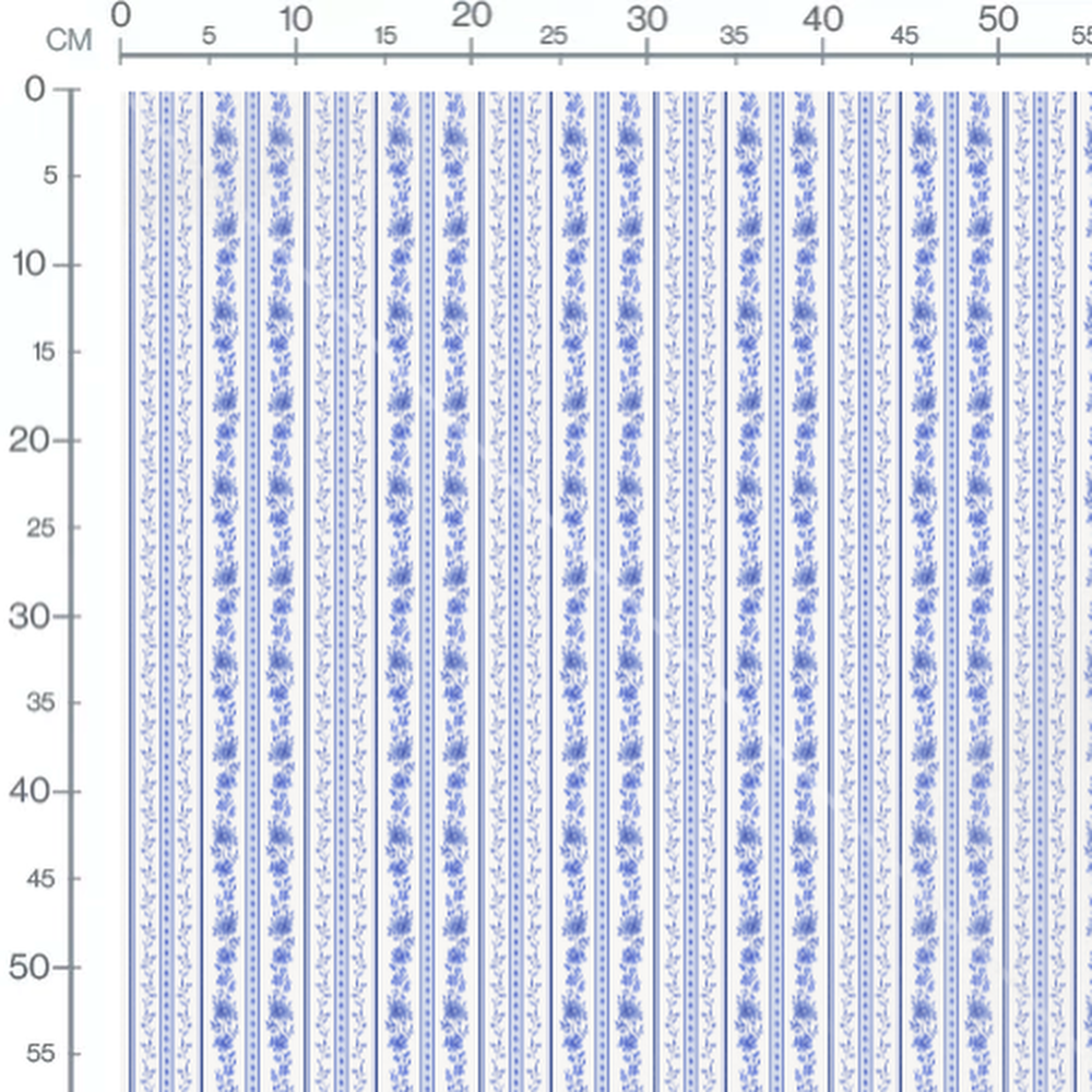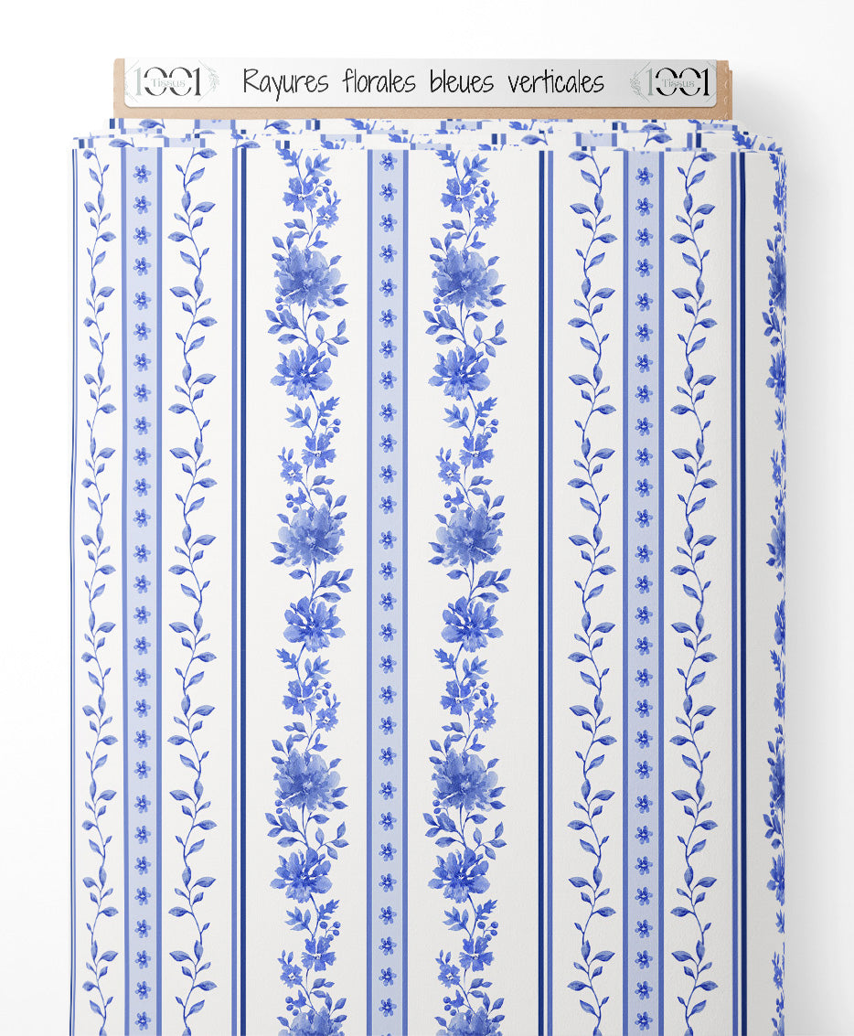 Les grandes fleurs bleues sont disposées en colonnes verticales. Entre les colonnes, des rayures fines avec des petites fleurs et des feuilles bleues ajoutent de la variété.Les tissus