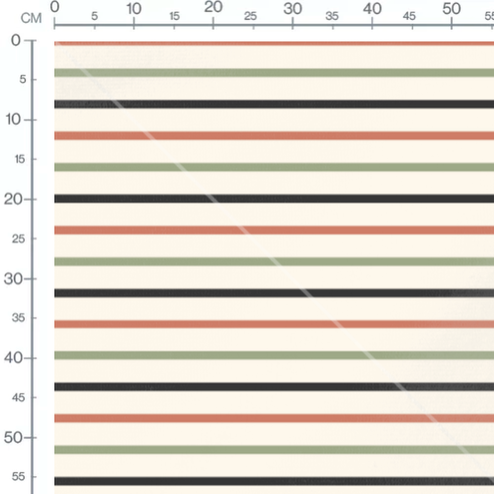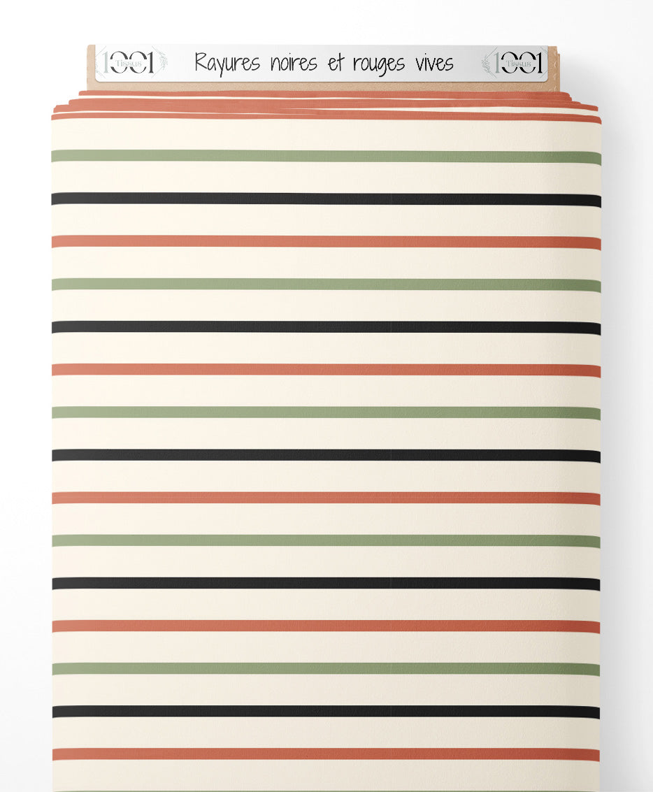 Les rayures noires sont épaisses et contrastent avec le fond clair. Les rayures vertes et rouges ajoutent une touche de couleur douce.Les tissus