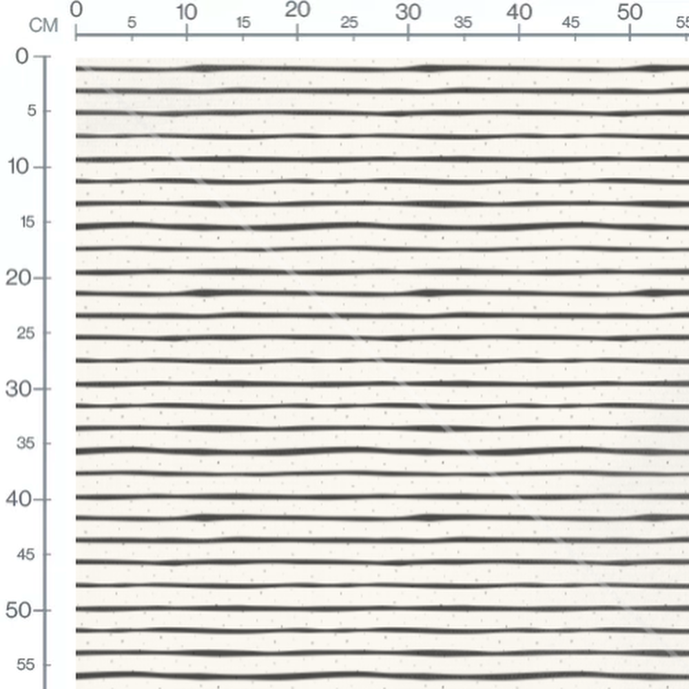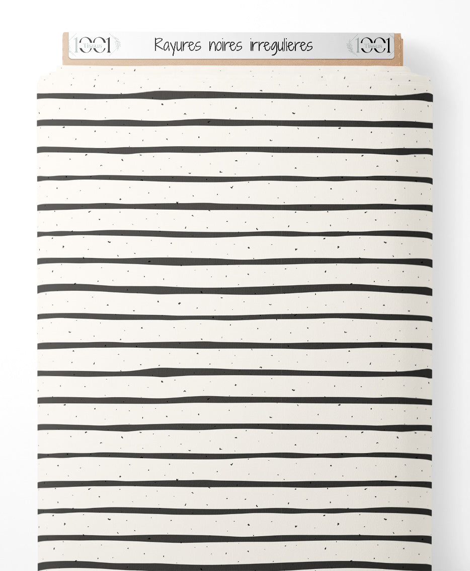 Les rayures noires varient en épaisseur et en espacement. Le fond blanc est parsemé de petites taches noires aléatoires.Les tissus