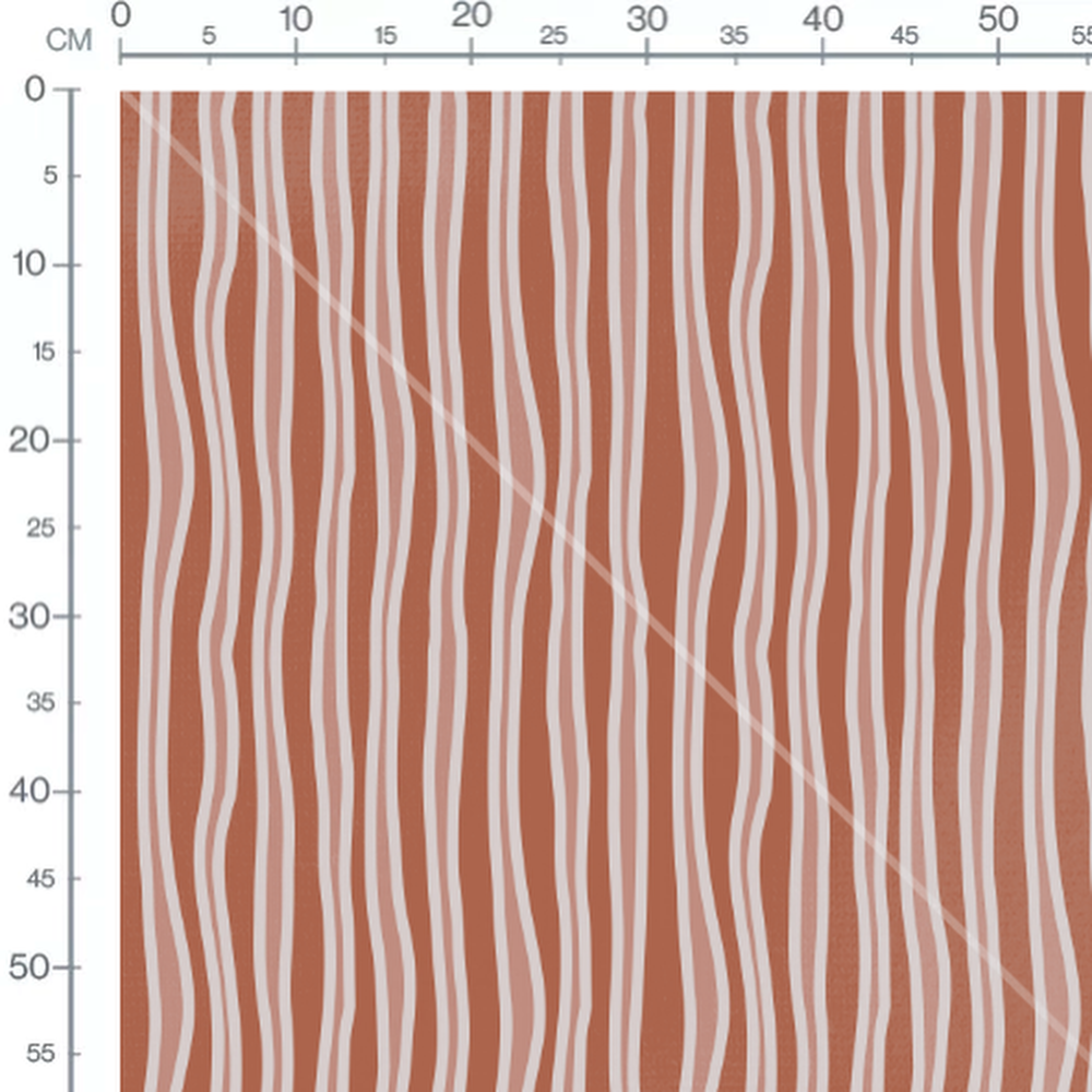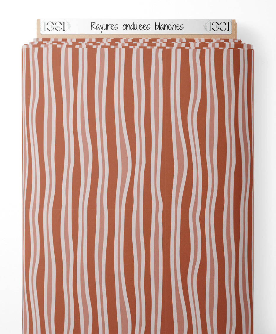 Les rayures blanches sont irrégulières et sinueuses. Le fond terracotta apporte une touche chaleureuse.Les tissus