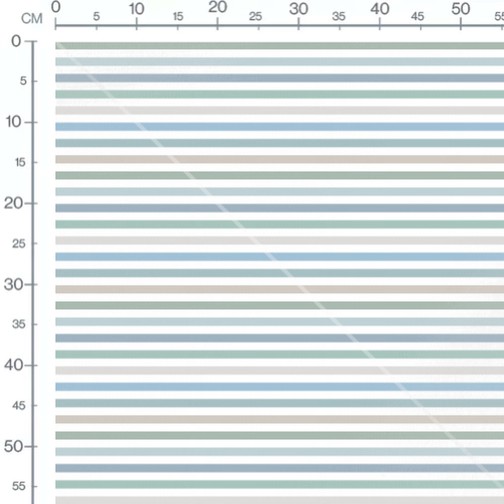 Les rayures alternent entre des teintes de bleu, vert et gris. Chaque bande est séparée par une section blanche. Les couleurs sont douces et pastel, créant un effet apaisant.Les tissus