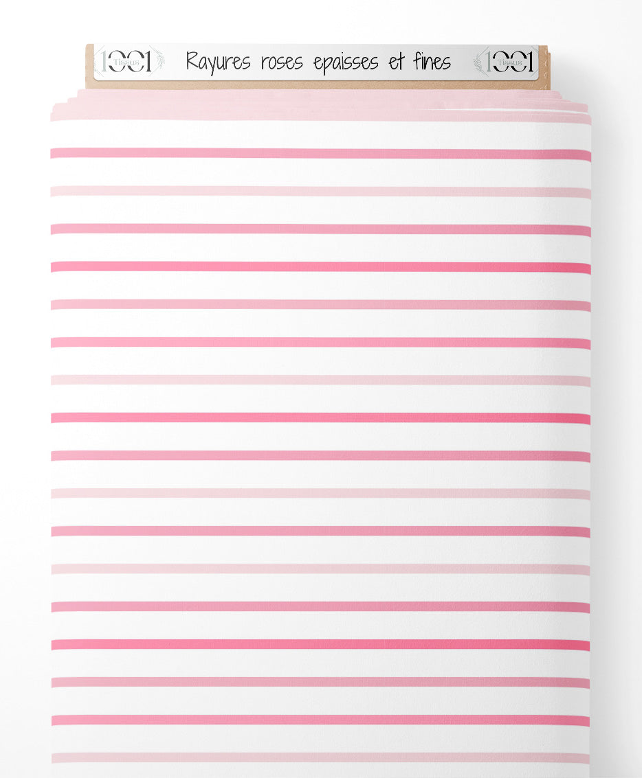Les rayures roses varient en épaisseur. Le fond blanc met en valeur les nuances de rose.Les tissus