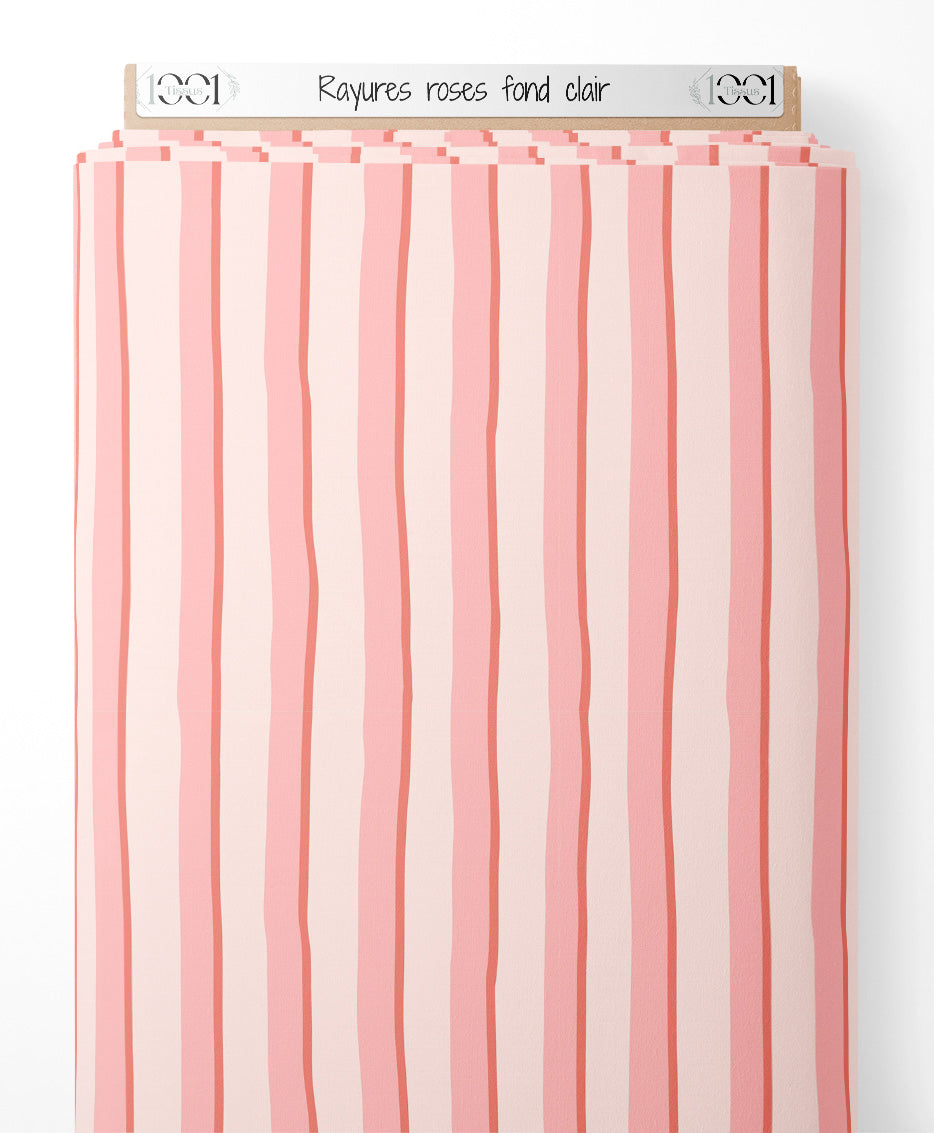 Les rayures présentent des nuances de rose allant du clair au foncé. Le fond rose clair met en valeur les motifs ondulés.Les tissus