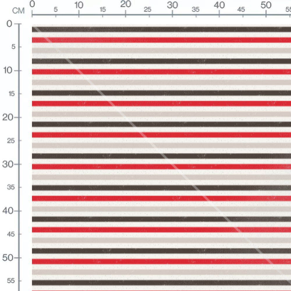 Les rayures rouges sont vives et alternent avec des rayures brunes et grises. Le fond beige ajoute une touche neutre au motif. L'effet texturé donne un aspect vintage aux rayures.Les tissus