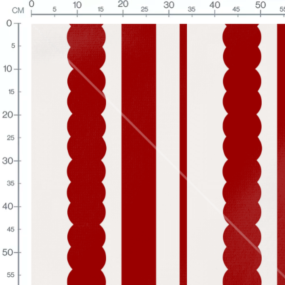 Les rayures rouges sont larges et régulières. Les cercles rouges sont alignés verticalement. Le fond blanc met en valeur le contraste des formes rouges.Les tissus