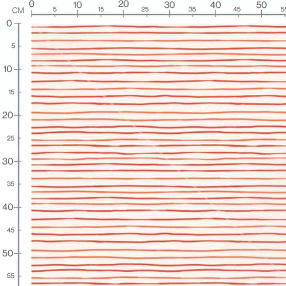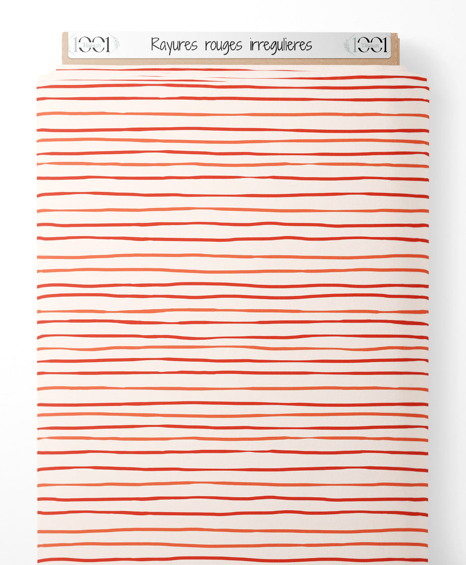 Les rayures varient en épaisseur et en intensité de couleur. Le fond beige crée un contraste doux avec les rayures rouges.Les tissus