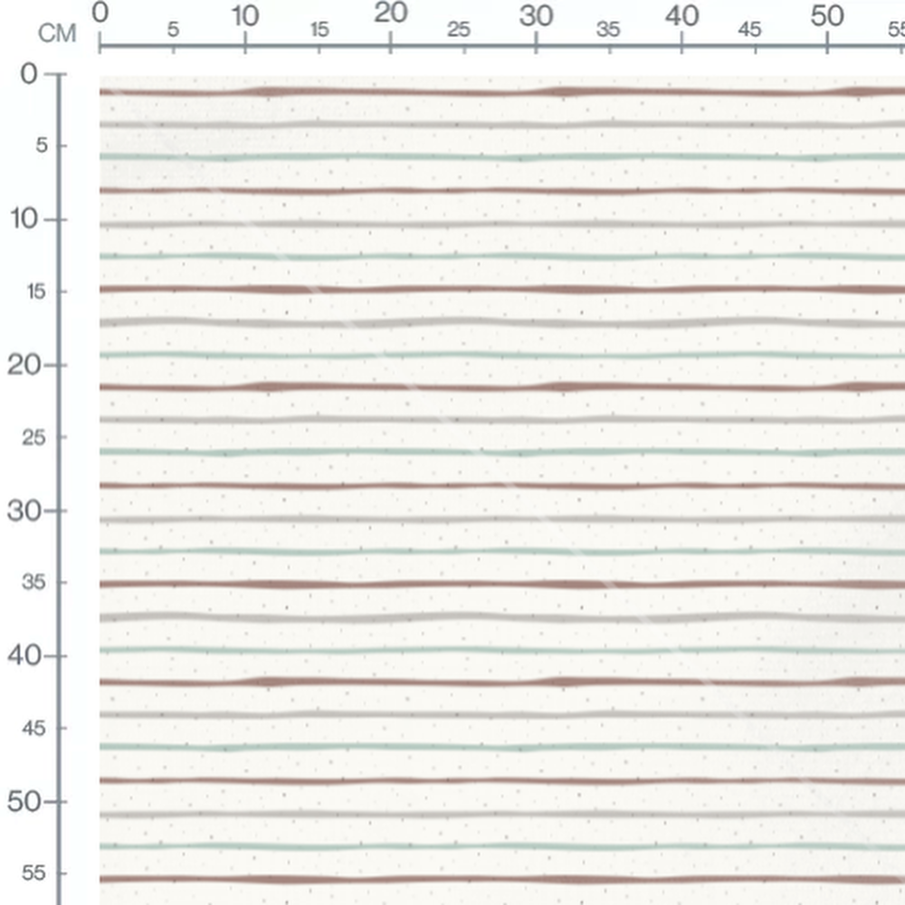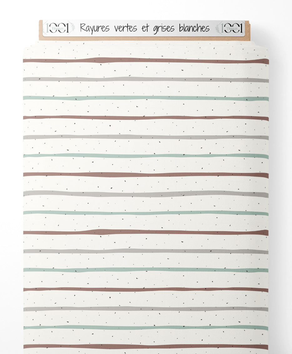 Les rayures marron, gris et vert sont espacées de manière irrégulière. Le fond blanc est parsemé de petites taches noires, ajoutant une texture subtile.Les tissus