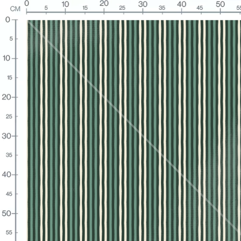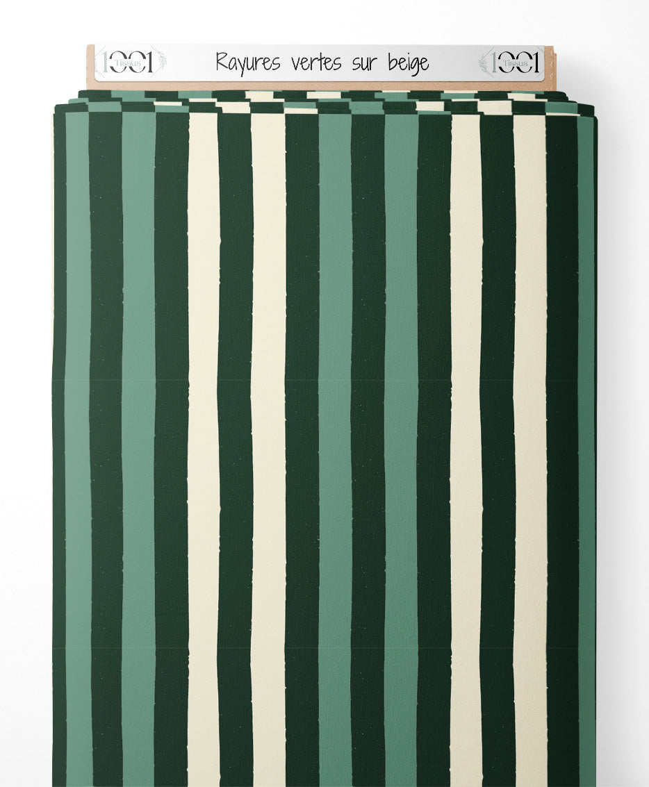 Les rayures sont de deux teintes de vert, une foncée et une plus claire. Le fond beige met en valeur les contrastes des rayures. Le motif est simple et répétitif, créant un effet visuel équilibré.Les tissus