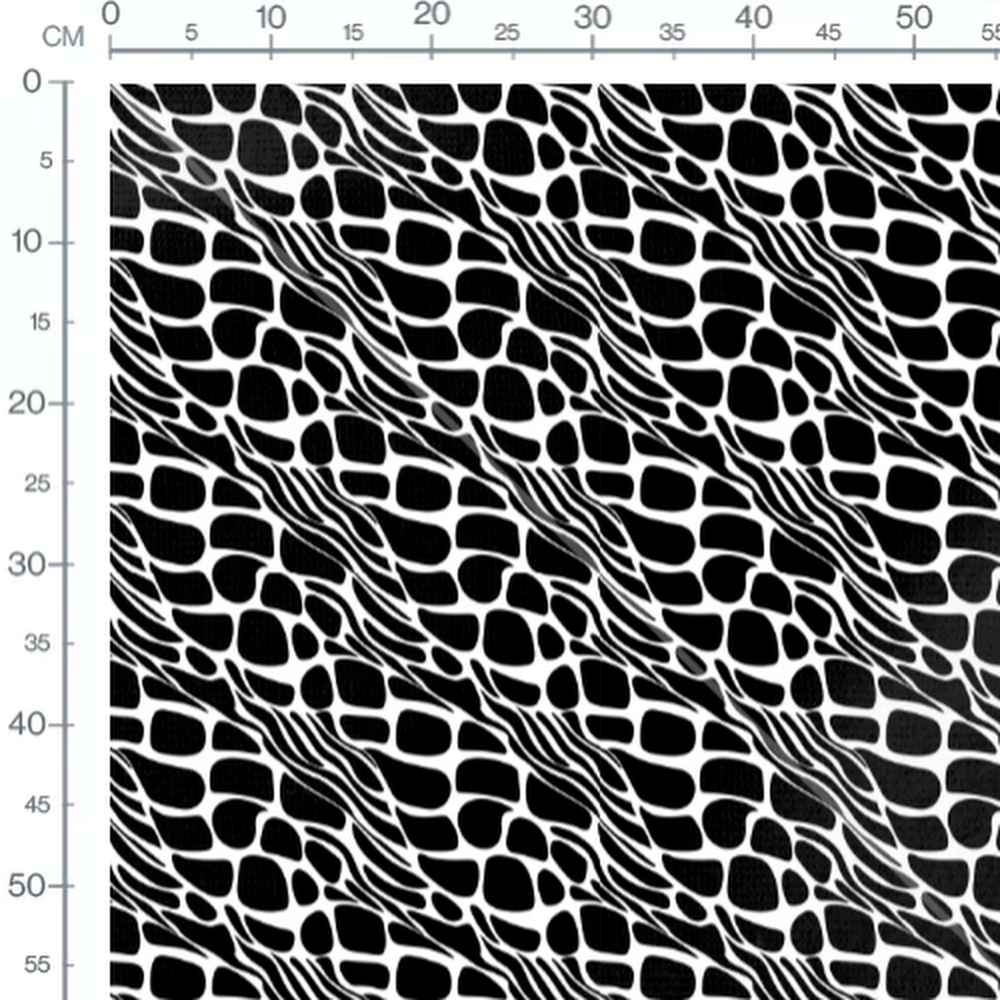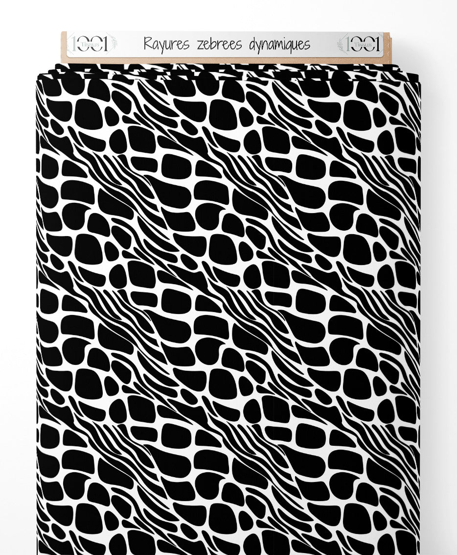 Les lignes noires imitent les rayures d'un zèbre. Les formes noires varient en taille et en forme, créant un effet dynamique.Les tissus