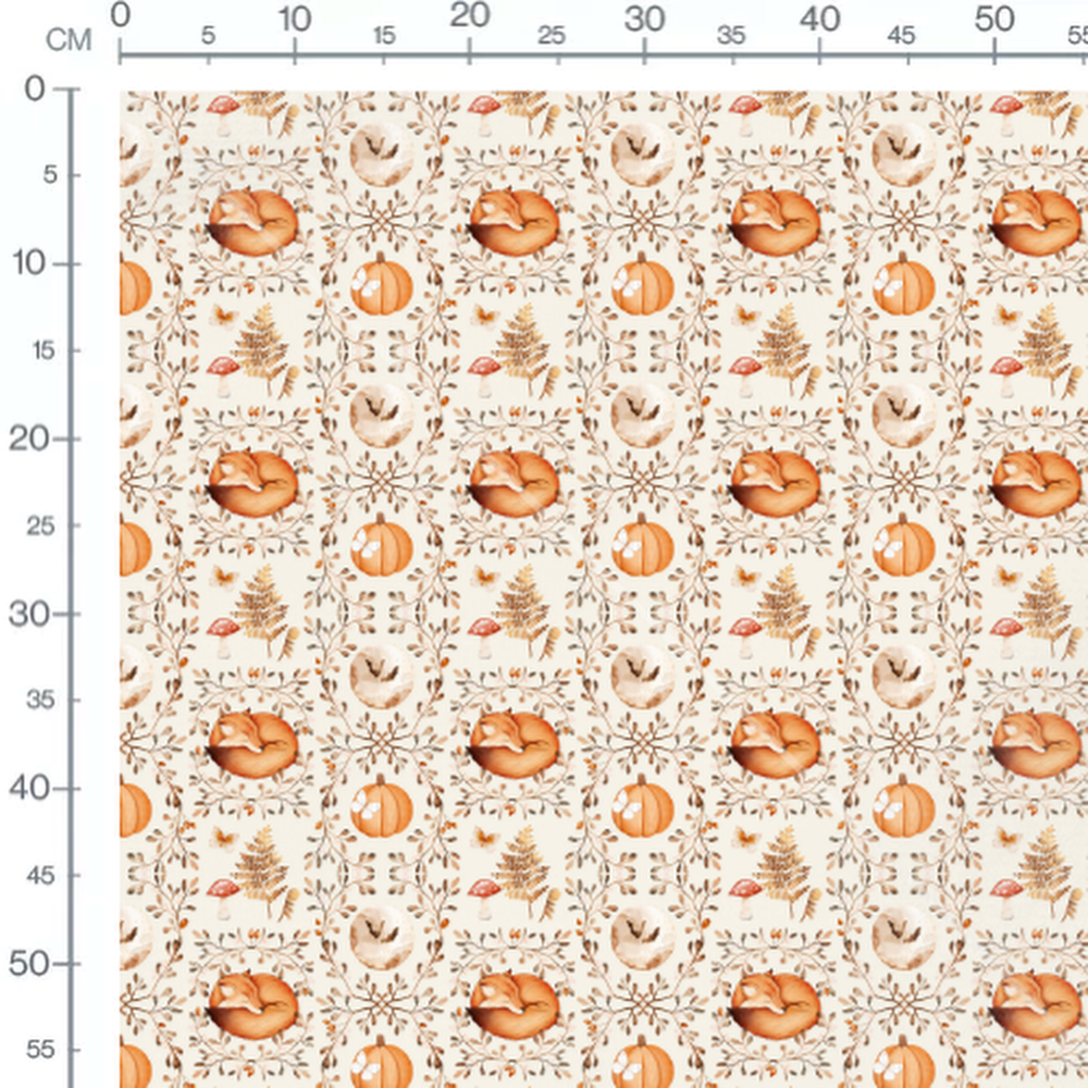 Des chauves-souris volent dans des cercles bruns. Des fougères et des glands ajoutent une touche naturelle.Les tissus