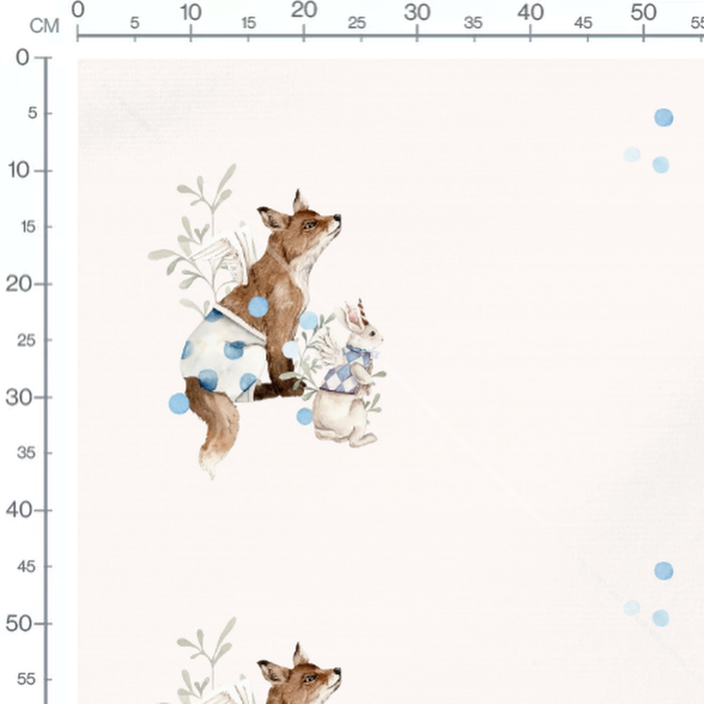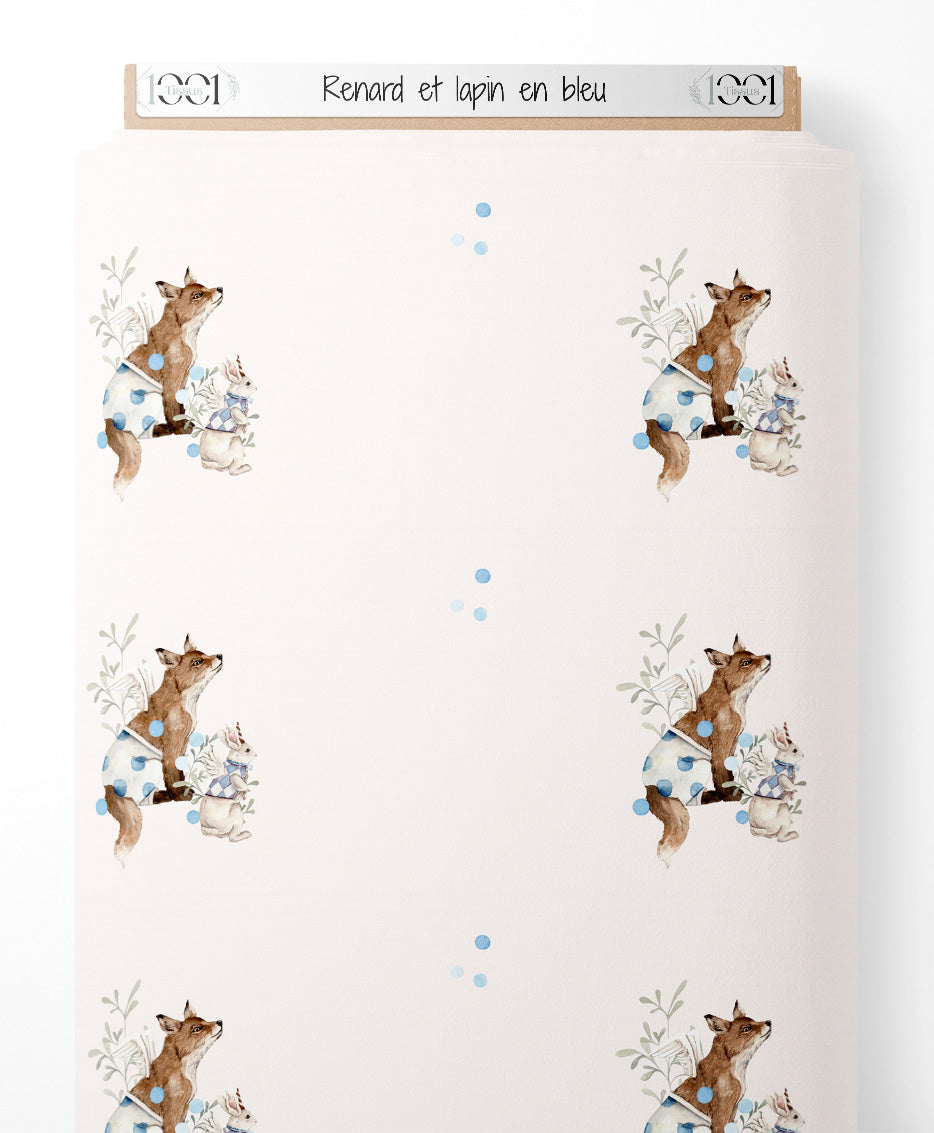Le renard est assis avec des feuilles autour de lui. Le lapin porte un vêtement bleu et se tient près du renard. Des bulles bleues flottent autour des animaux.Les tissus