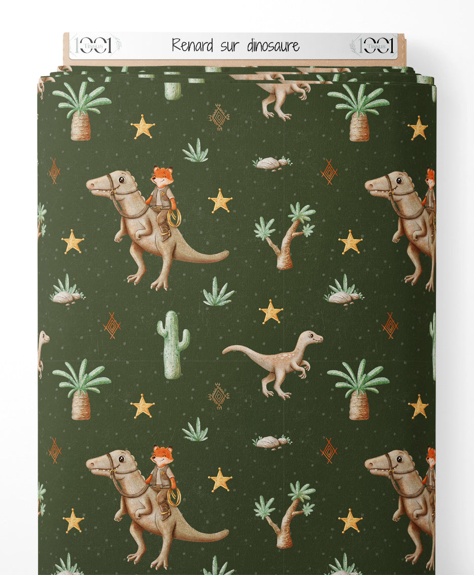 Cactus verts et motifs géométriques rouges ajoutent des détails. Petits points blancs parsèment le fond. Dinosaures supplémentaires en arrière-plan.Les tissus