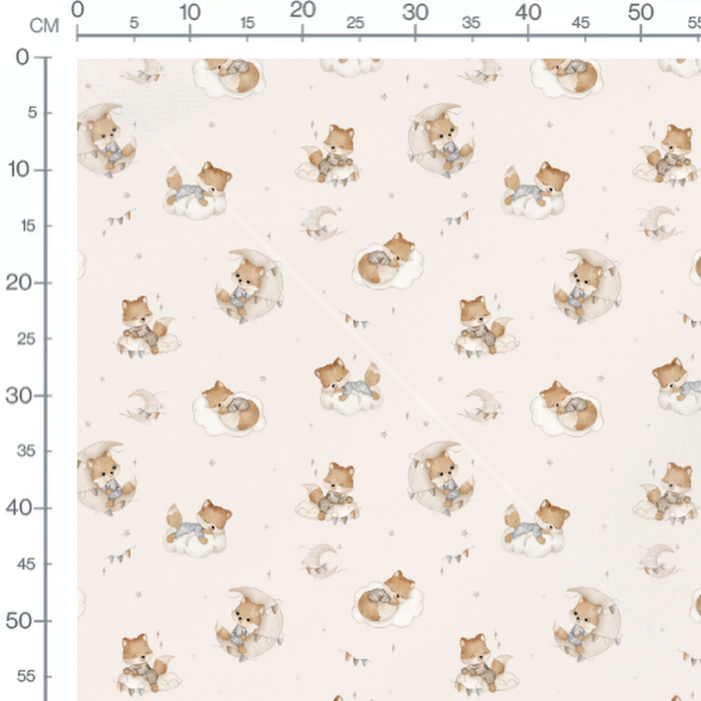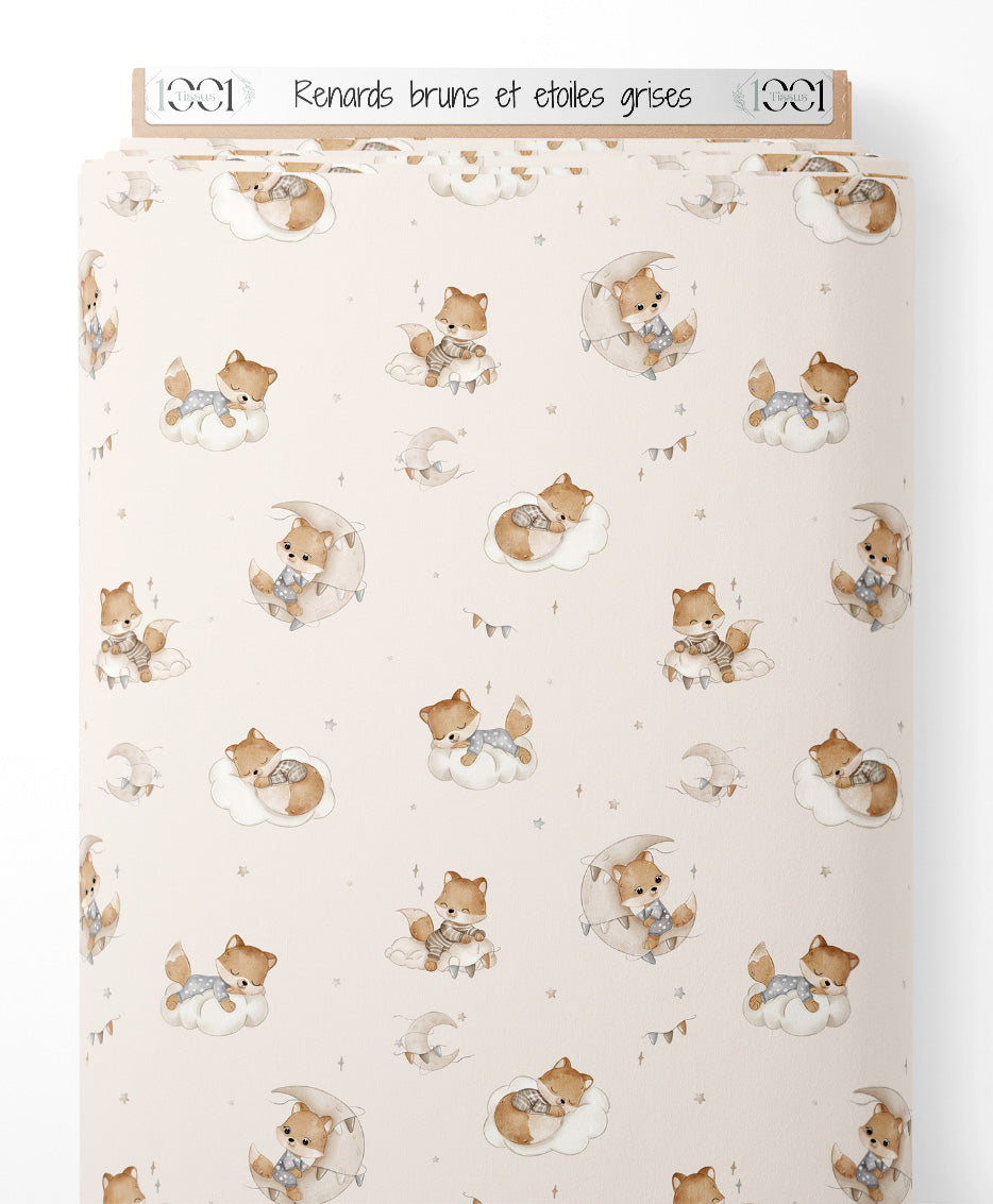 Les renards portent des vêtements gris à motifs. Des guirlandes colorées ajoutent une touche festive. Les étoiles sont dispersées autour des renards et des nuages.Les tissus