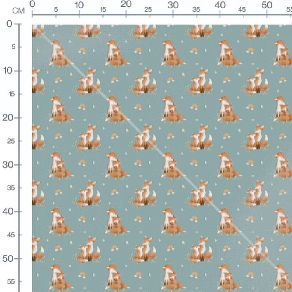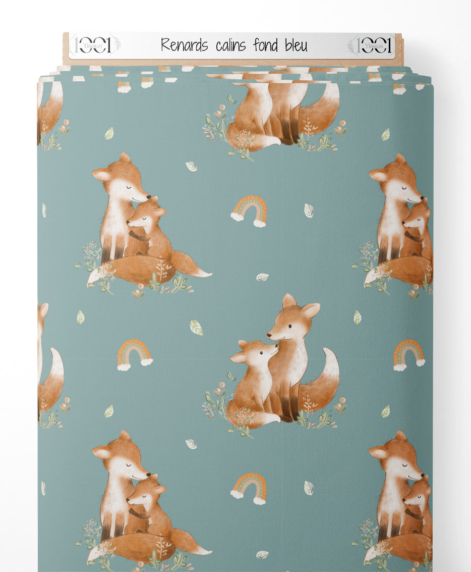 Les renards sont entourés de petites fleurs et de feuilles vertes. De petits arcs-en-ciel ajoutent une touche colorée au motif. Le fond bleu crée une ambiance douce et apaisante.Les tissus
