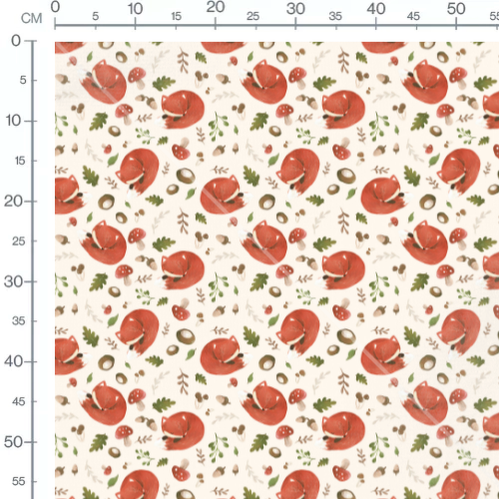 Les renards sont entourés de champignons rouges à pois blancs. Des feuilles vertes et brunes complètent le motif. Quelques glands et noisettes sont dispersés sur le fond crème.Les tissus