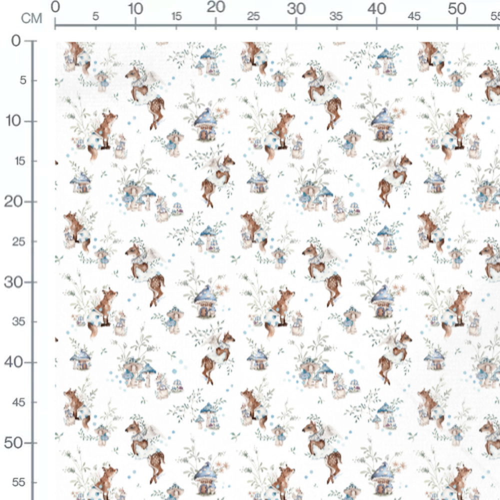 Les renards sont accompagnés de champignons aux teintes bleues et de petites maisons champignons. Des feuillages délicats et des points bleus ajoutent une touche de fantaisie. Les couleurs douces créent une ambiance féerique et naturelle.Les tissus