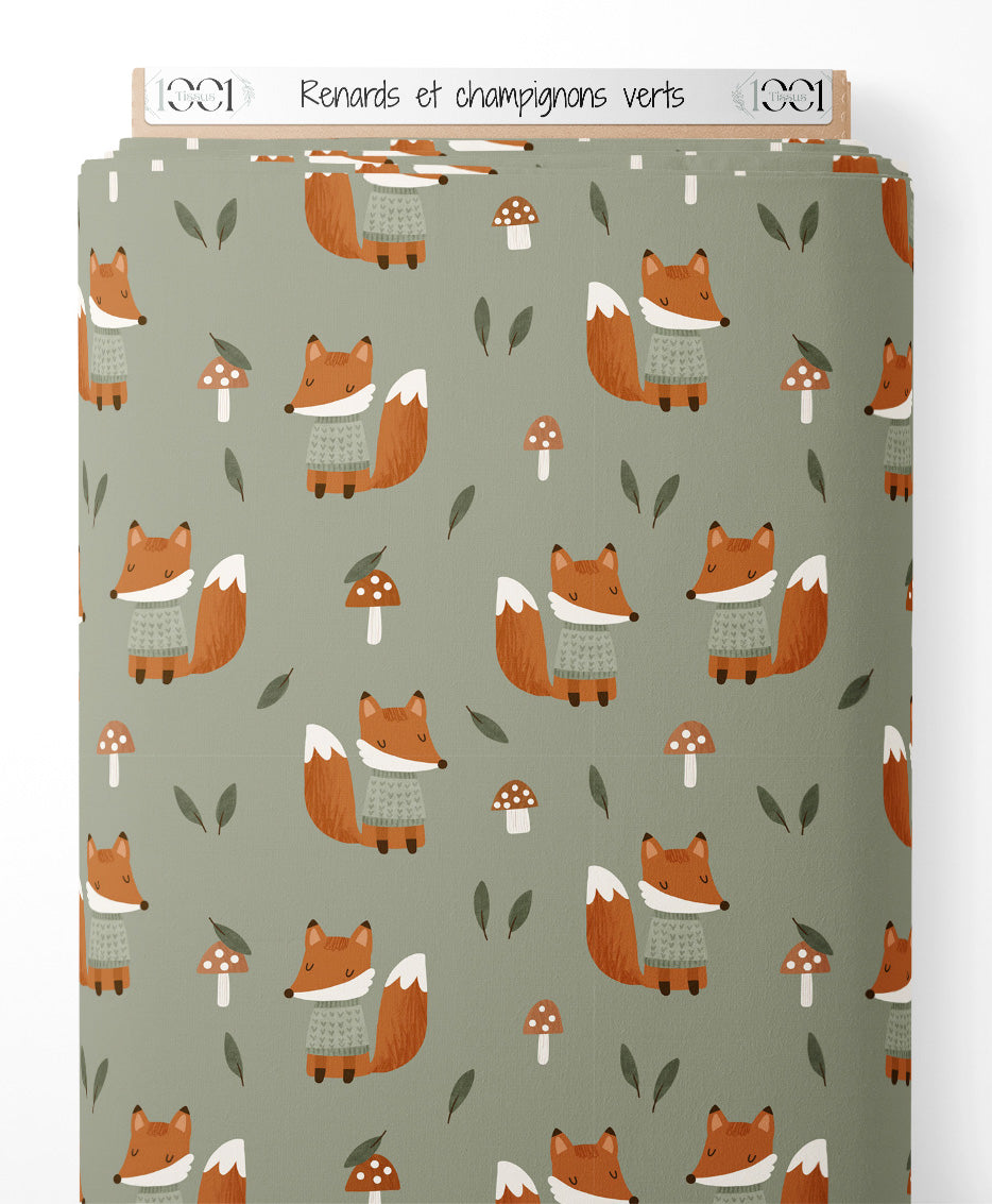Les renards portent des pulls avec un motif discret. Les champignons sont parsemés autour des renards. De petites feuilles vertes complètent le motif.Les tissus