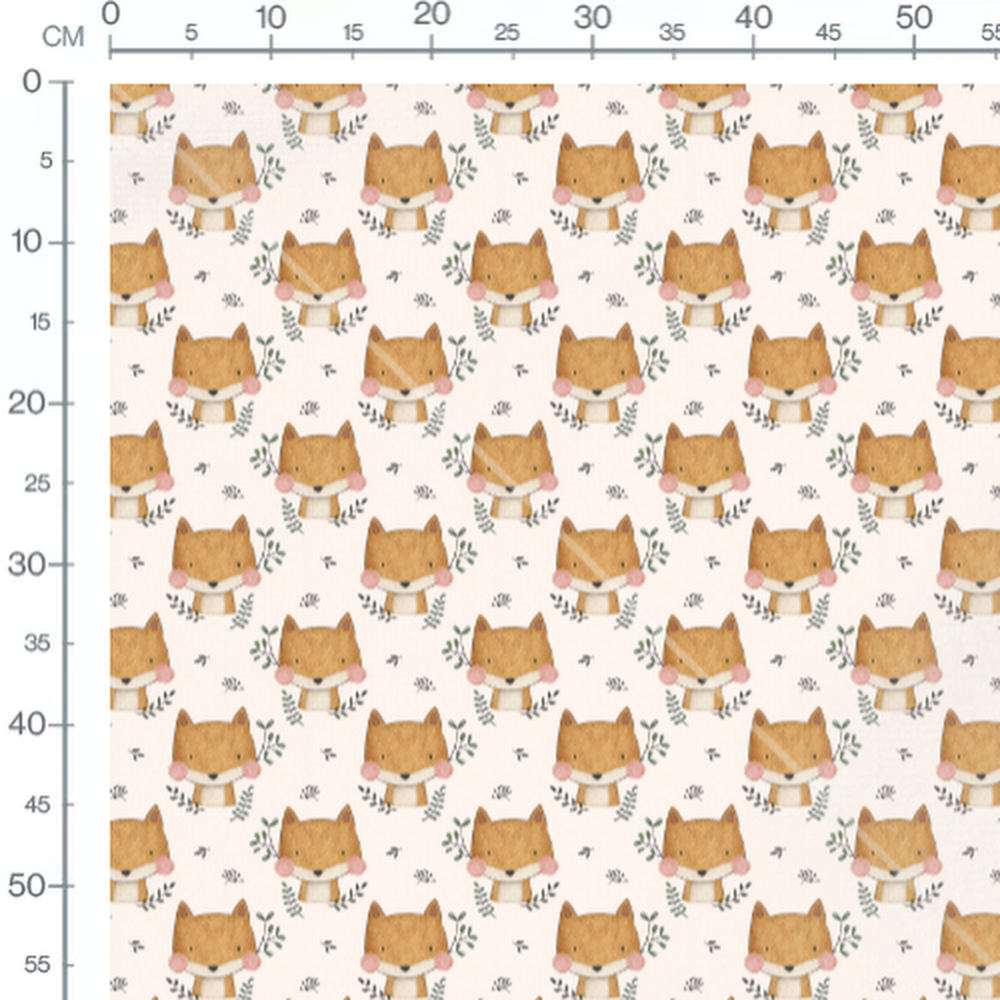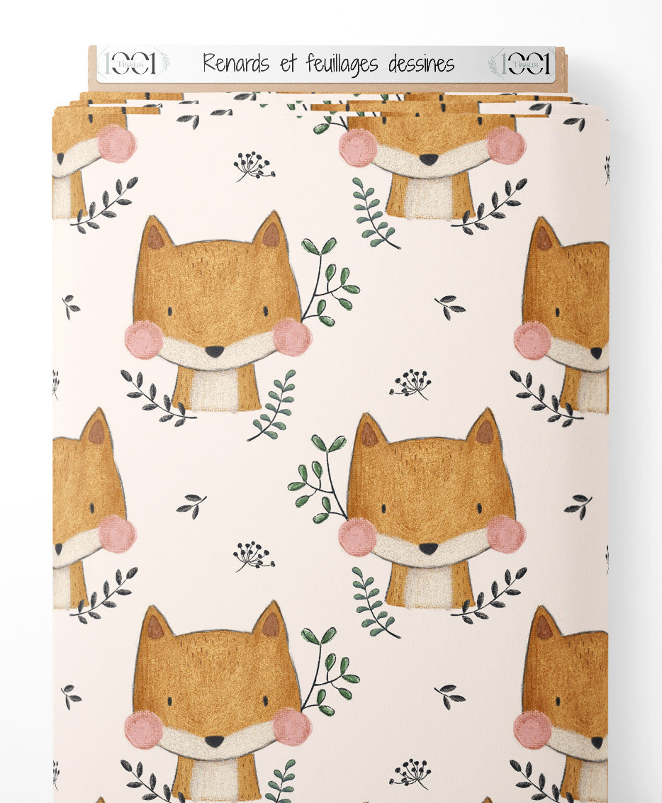 Les renards ont des joues roses et des oreilles pointues. Les feuillages sont délicatement dessinés en vert et noir. Le fond beige met en valeur les motifs de renards et de feuillages.Les tissus