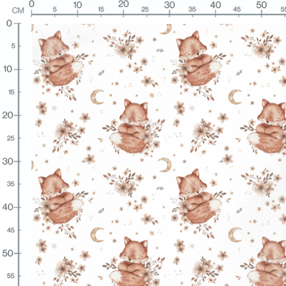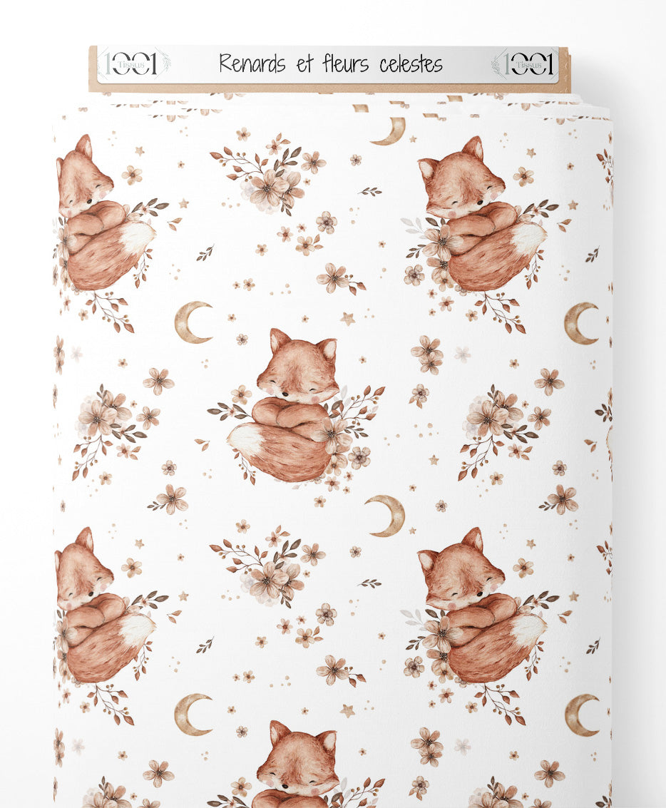 Les renards sont entourés de délicates fleurs beige et de petites feuilles. Des croissants de lune et des étoiles ajoutent une touche céleste au motif. Les couleurs pastel créent une ambiance douce et apaisante.Les tissus
