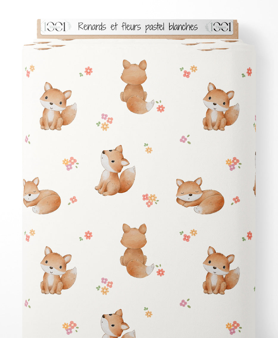 Tissu - Renards et fleurs pastel blanches
