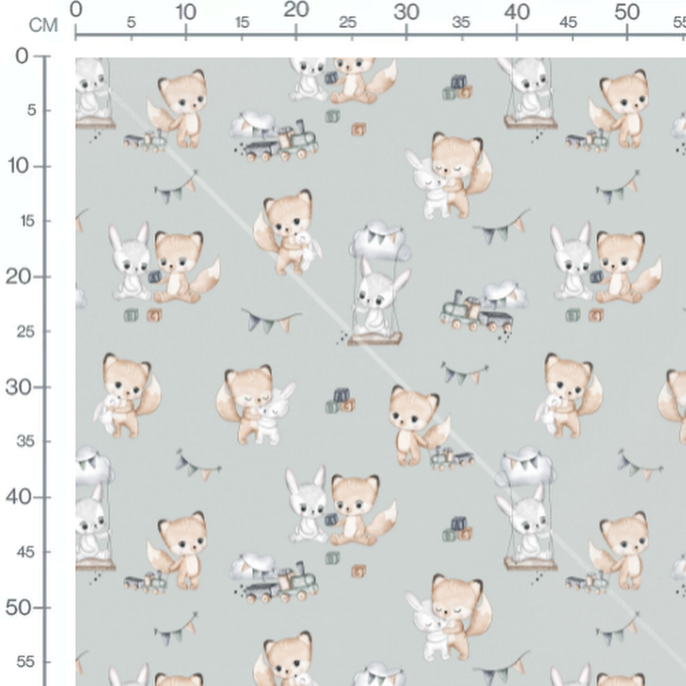 Les renards tiennent des lapins en peluche. Des jouets comme des trains et des cubes sont dispersés. Des fanions multicolores ajoutent une touche festive.Les tissus