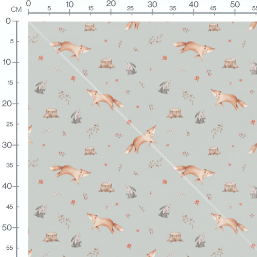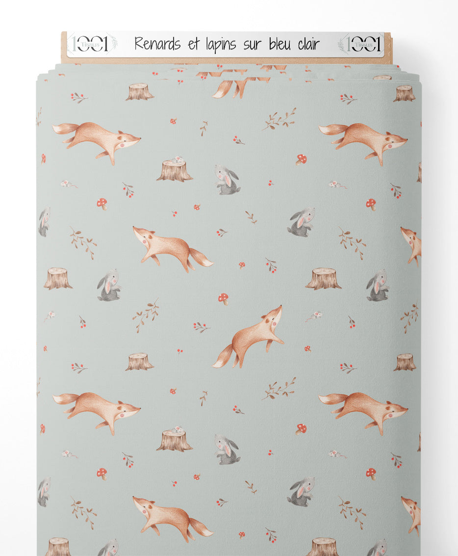 Les renards sont de couleur brun clair avec des détails blancs. Les lapins sont gris avec des oreilles roses. Les souches d'arbres sont marron clair avec des détails de mousse. De petites fleurs rouges et des branches marron ajoutent des touches de couleur.Les tissus