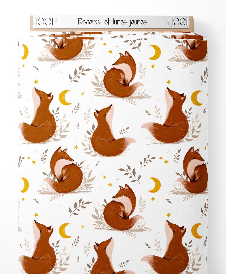 Les renards sont entourés de petites feuilles grises. Des lunes et des étoiles jaunes parsèment le fond blanc.Les tissus