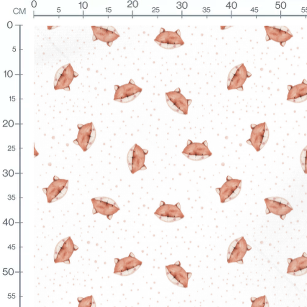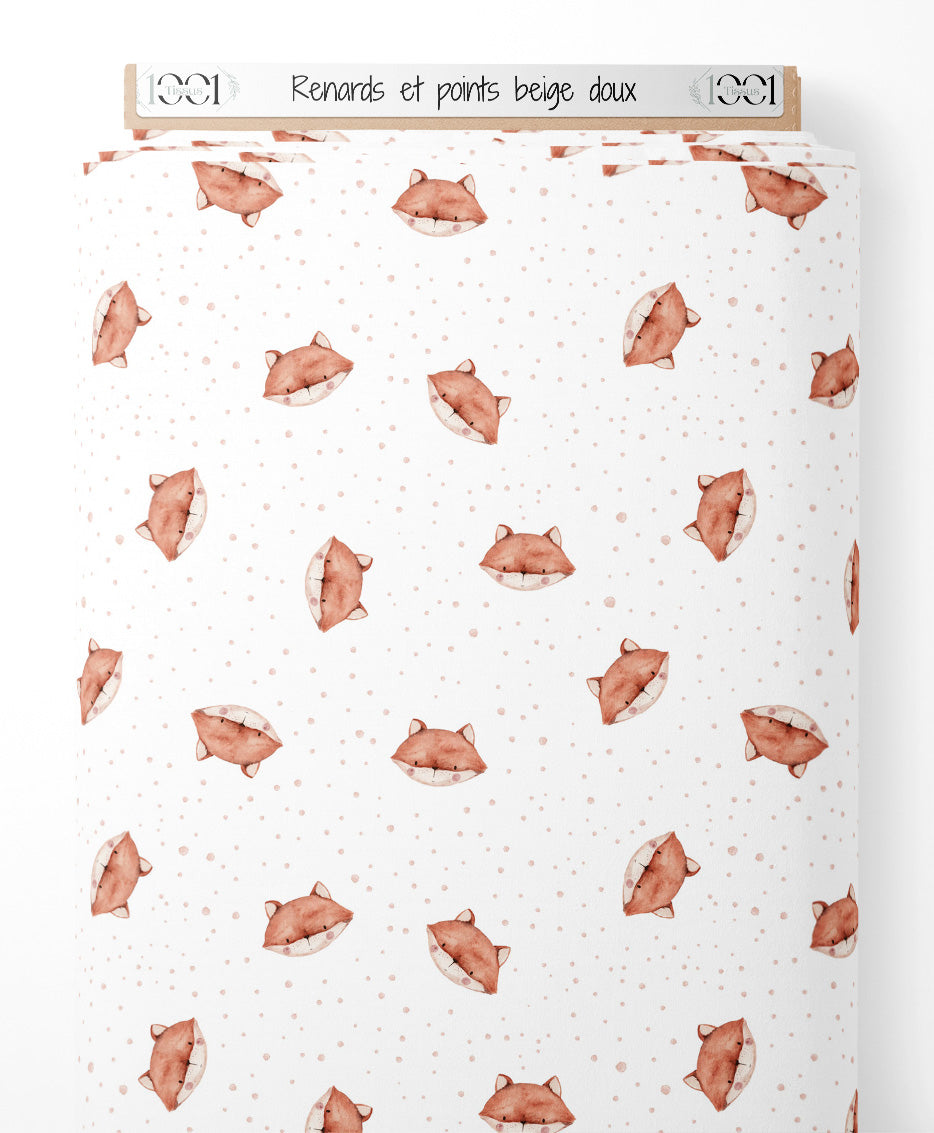 Les renards sont dessinés dans un style aquarelle avec des teintes marron et beige. Le fond blanc est parsemé de petits points beige, ajoutant une touche de douceur au motif.Les tissus