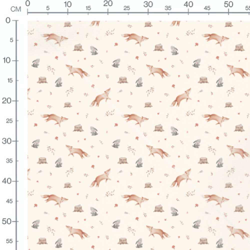 Petites branches et baies rouges ajoutent des détails délicats. Les renards sont dessinés dans des tons chauds. Les lapins sont en nuances de gris doux. Les souches d'arbres sont décorées de petites fleurs.Les tissus