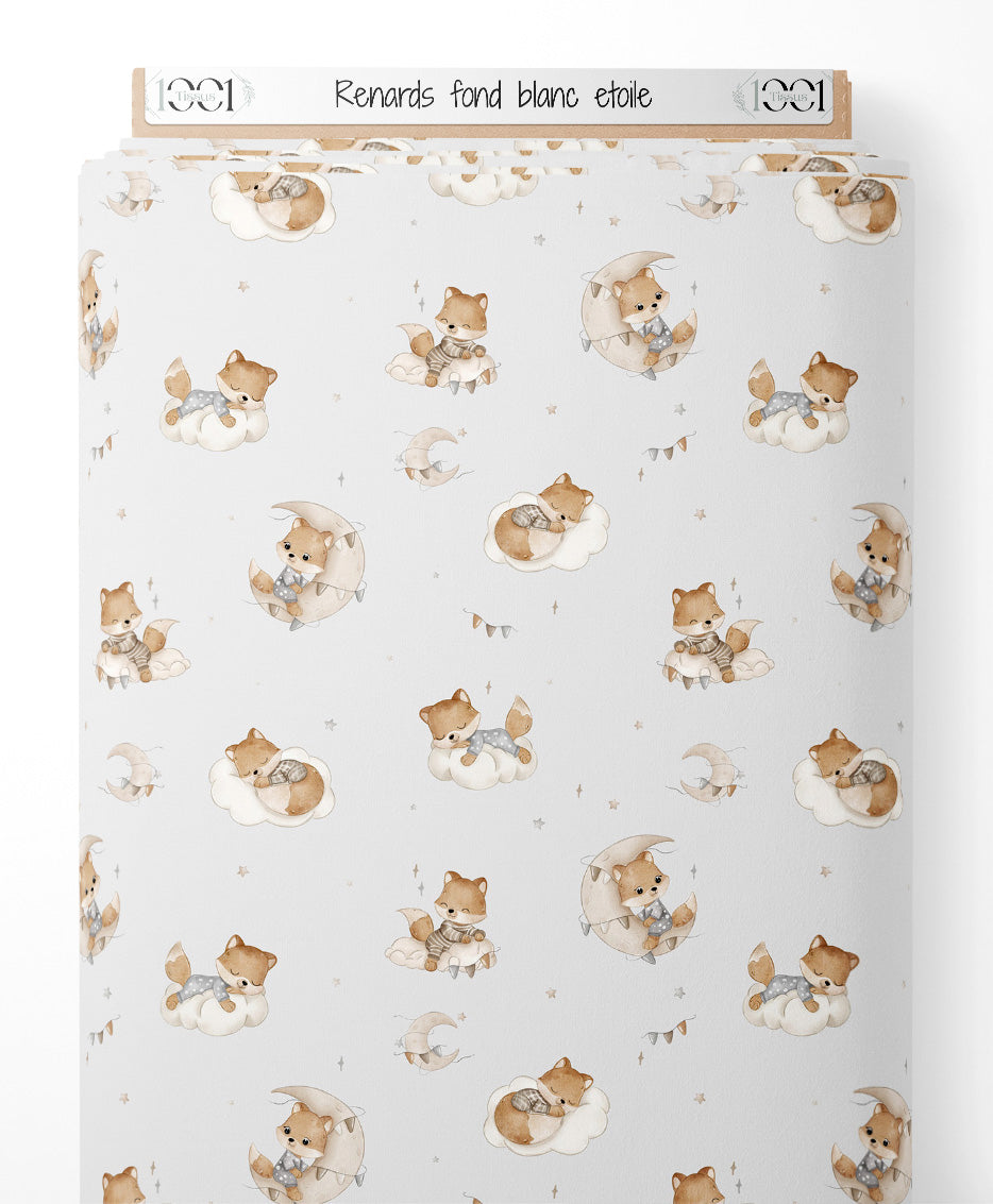 Les renards portent des vêtements gris à motifs. Des guirlandes de fanions colorés décorent le fond. Les lunes sont légèrement ombrées pour un effet doux.Les tissus