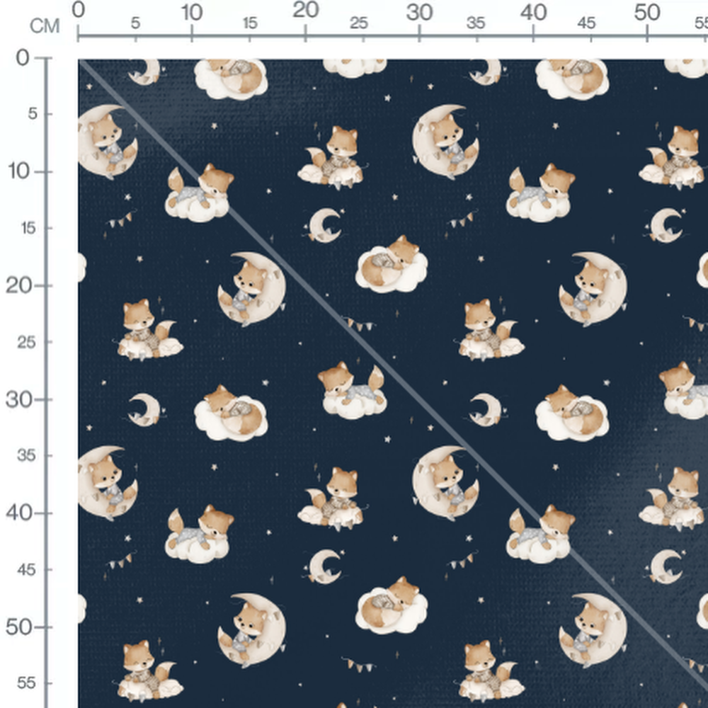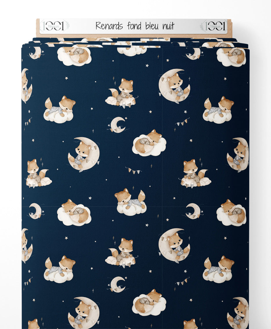Les renards portent des vêtements à motifs discrets. Les lunes et nuages sont parsemés de petites étoiles. Les guirlandes ajoutent une touche festive au design.Les tissus