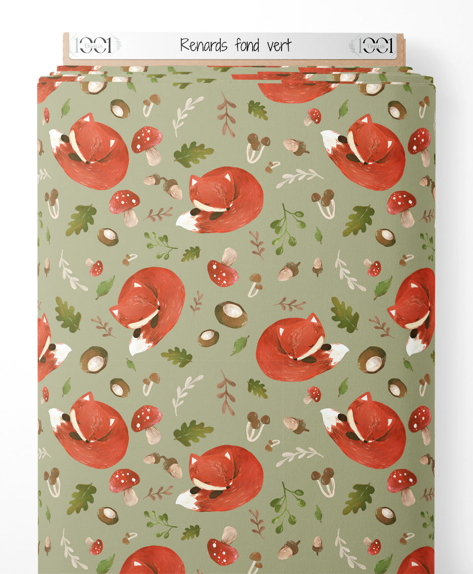 Tissu - Renards sur fond vert