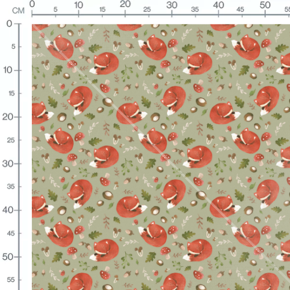 Les renards sont entourés de champignons rouges à pois blancs. Des feuilles de différentes formes et teintes de vert et brun complètent le motif.Les tissus