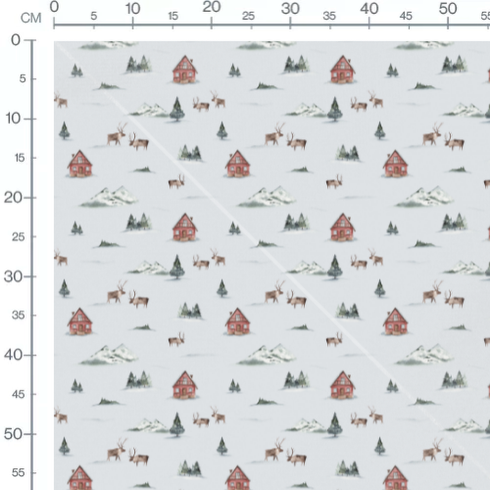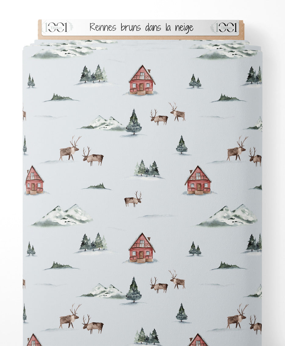 Les chalets rouges apportent une touche chaleureuse au paysage. Les rennes bruns se tiennent paisiblement parmi les sapins. Les montagnes grises ajoutent une dimension de profondeur. Le fond blanc neige évoque un paysage hivernal serein.Les tissus