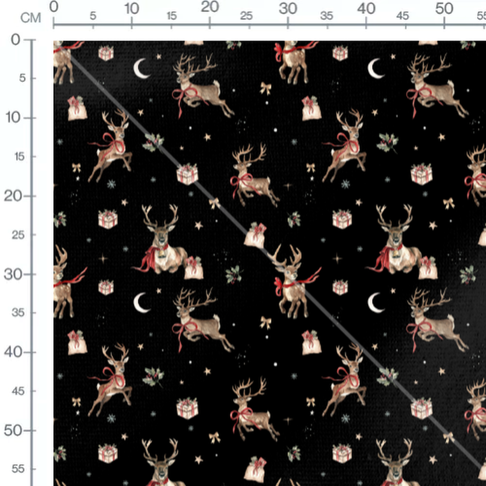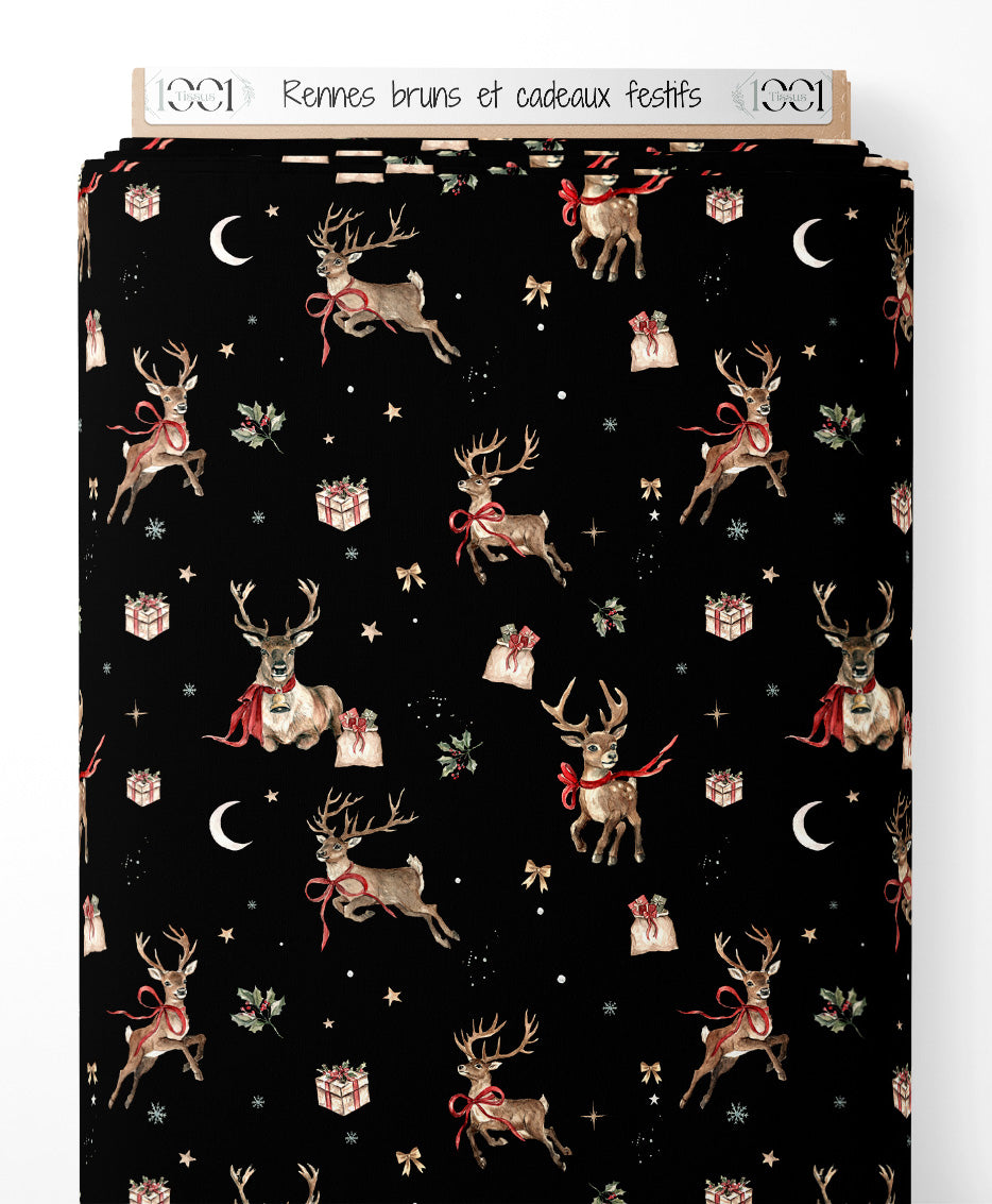 Les rennes portent des rubans rouges autour du cou. Des paquets cadeaux et des branches de houx ajoutent une touche festive. Des étoiles et un croissant de lune complètent le motif. Des nœuds dorés et des flocons de neige sont également présents.Les tissus
