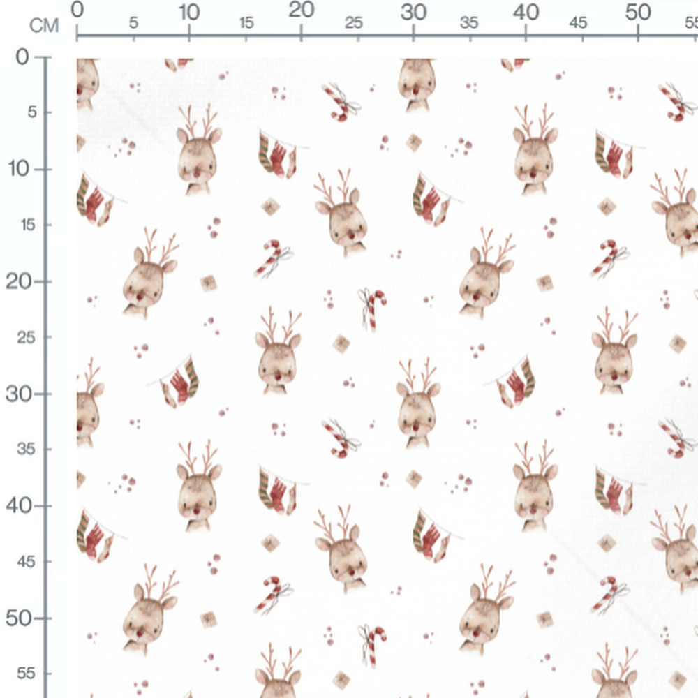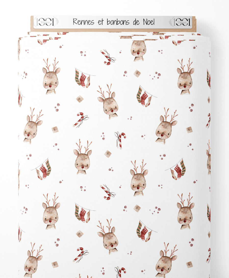 Les rennes ont des bois délicats et des nez rouges. Les bonbons sont en forme de canne avec des rayures rouges et blanches. Les chaussettes sont décorées de rayures rouges et vertes. De petits points marron ajoutent un détail subtil au motif.Les tissus