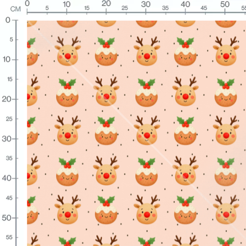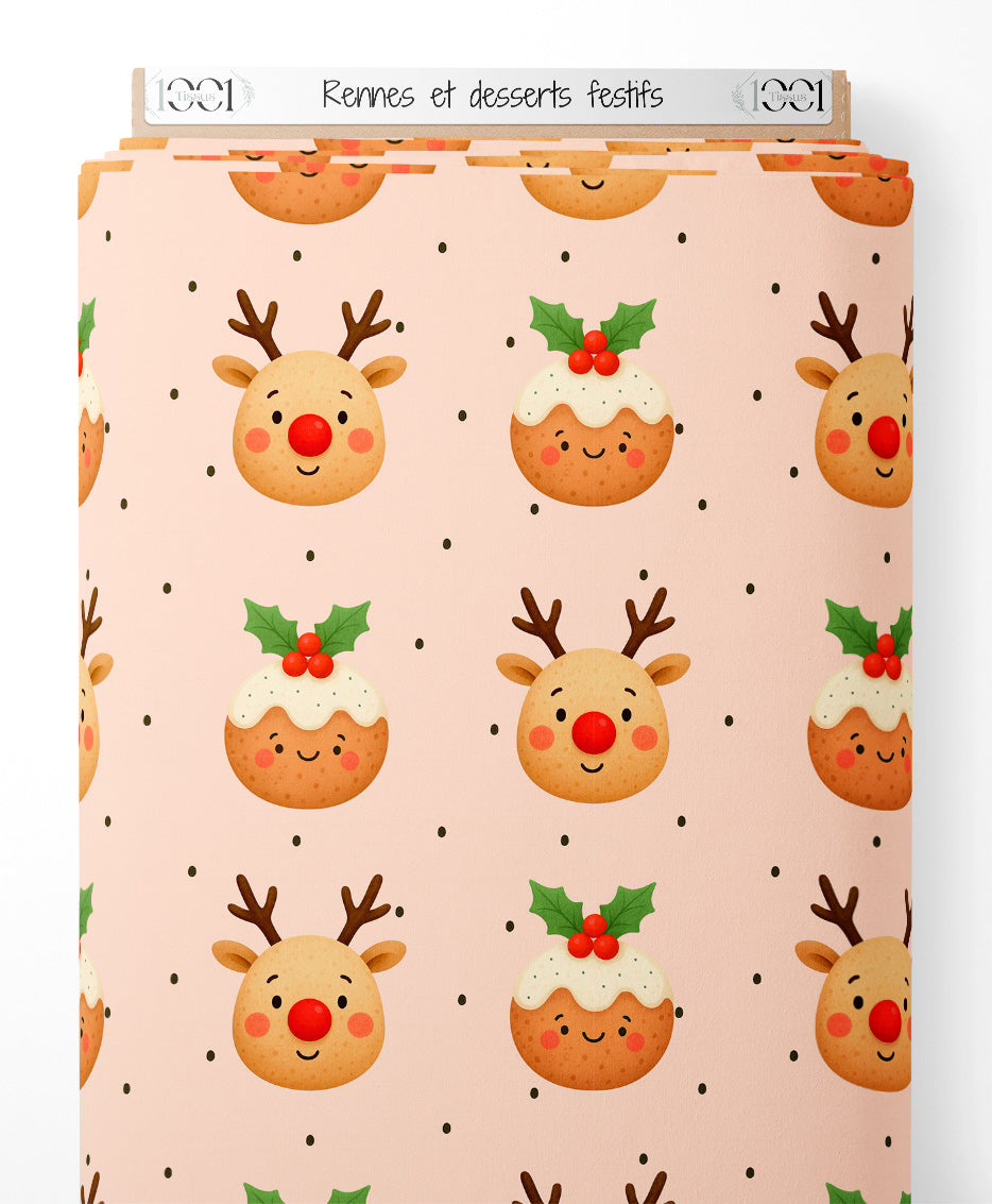 Les rennes ont des bois bruns et des joues roses. Les desserts sont décorés de feuilles de houx vertes et de baies rouges.Les tissus