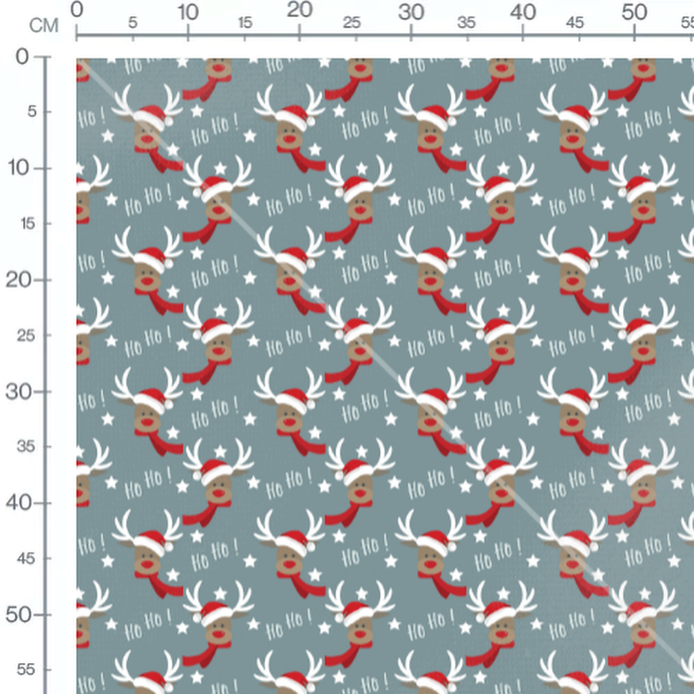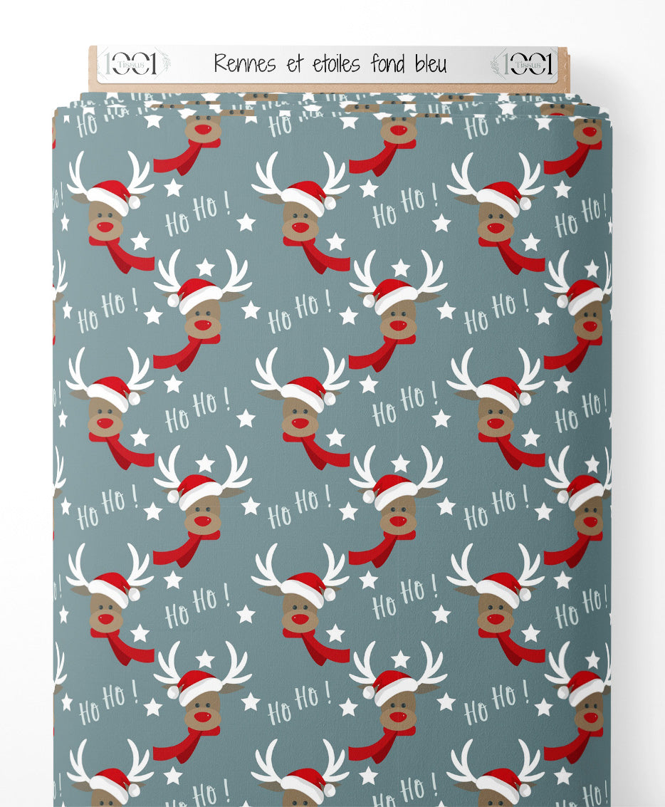 Les rennes portent des chapeaux de Noël rouges et des écharpes assorties. Le fond bleu est parsemé d'étoiles blanches et du texte 'Ho Ho !' en blanc.Les tissus