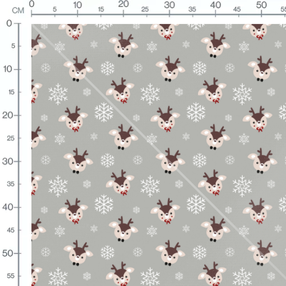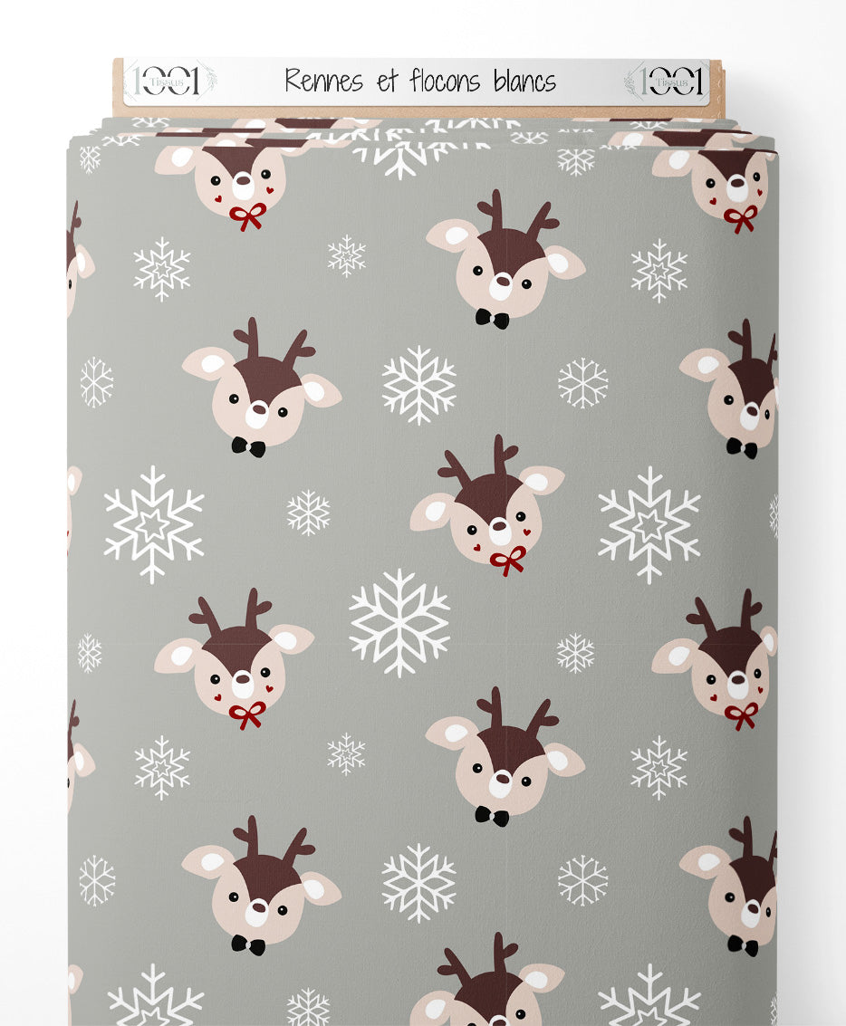 Les rennes ont des oreilles beiges et des museaux noirs. Les flocons varient en taille et en forme, ajoutant une touche hivernale.Les tissus