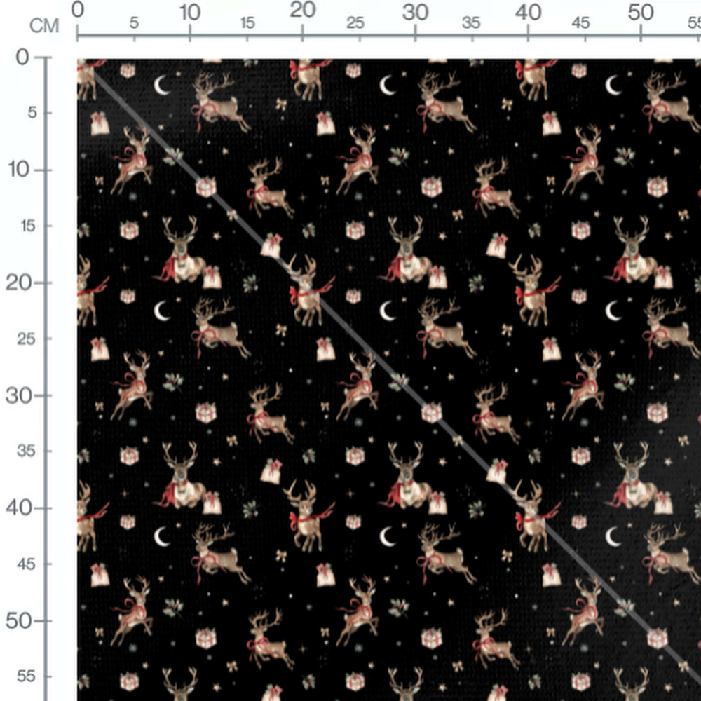Petits flocons blancs et étoiles dorées entourent les rennes. Présence de houx vert et rouge. Petits nœuds dorés ajoutent une touche festive.Les tissus