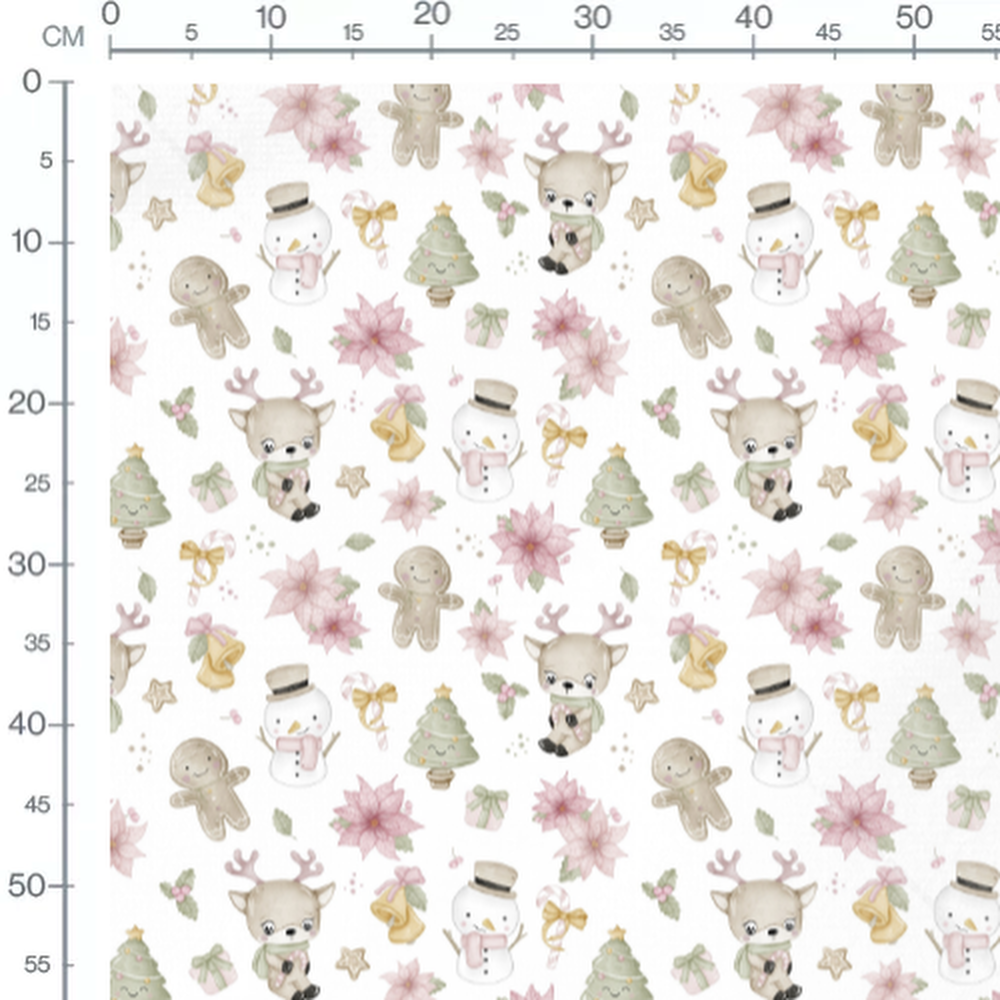 Petits sapins décorés et cadeaux verts et jaunes. Biscuits en forme de bonhomme et cannes en sucre. Fleurs de poinsettia roses dispersées.Les tissus