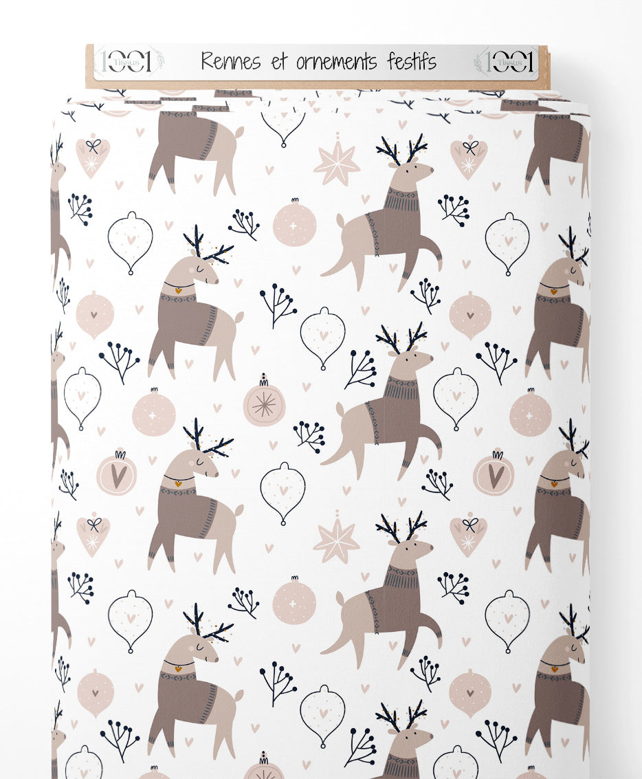 Petits cœurs et branches noires ajoutent des détails. Les rennes portent des colliers dorés. Les ornements incluent des formes de cœurs et de boules décoratives.Les tissus
