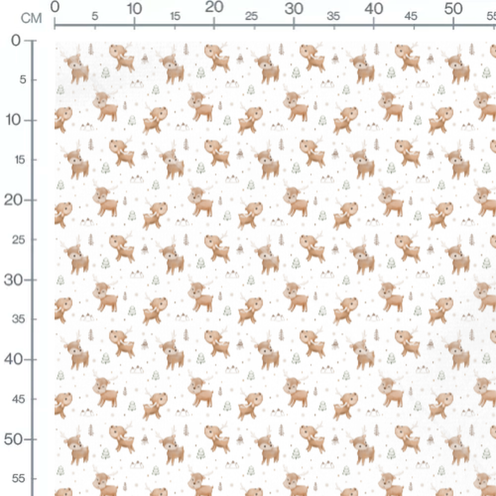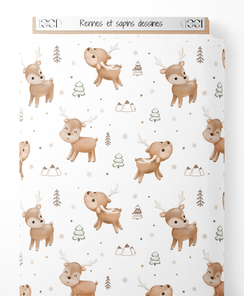 Petits points gris et marron ajoutent des détails au fond. Les rennes ont des expressions joyeuses et amicales. Les sapins et montagnes sont stylisés de manière simple.Les tissus