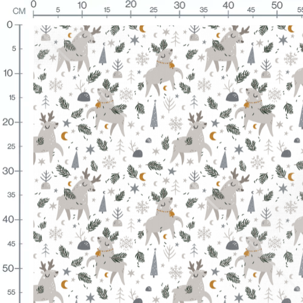 Les rennes portent des écharpes orange. Des branches de sapin vert foncé parsèment le motif. Des étoiles et des lunes ajoutent une touche festive.Les tissus