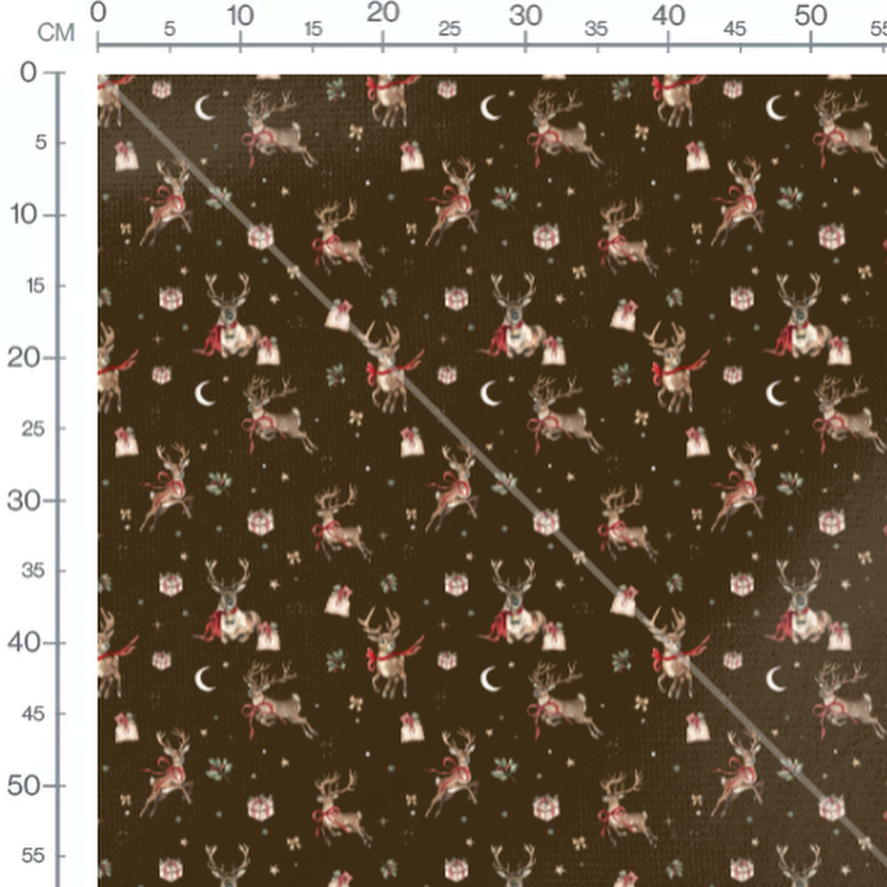 Des rennes ornés de rubans rouges sautent joyeusement. Des paquets cadeaux et des branches de houx ajoutent une touche festive. Des étoiles et des nœuds dorés complètent le motif. La lune et des flocons de neige apportent une ambiance hivernale.Les tissus