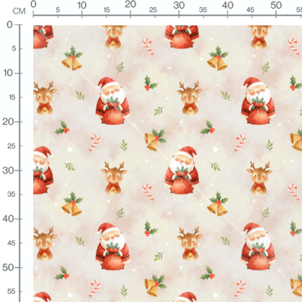 Des cannes à sucre rouges et blanches ajoutent une touche festive. Les feuilles de houx sont accompagnées de petites baies rouges. Des touches de vert avec des petites branches feuillues complètent le motif.Les tissus