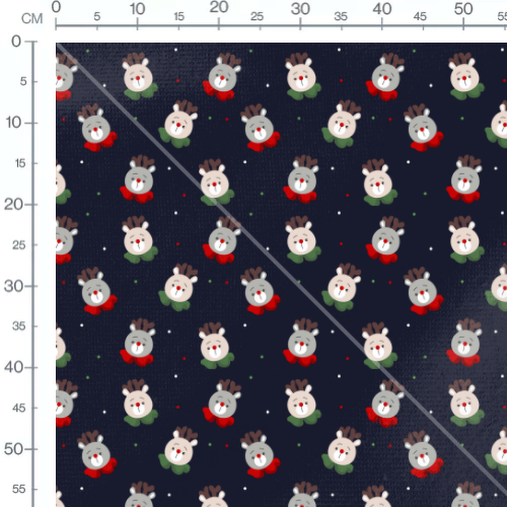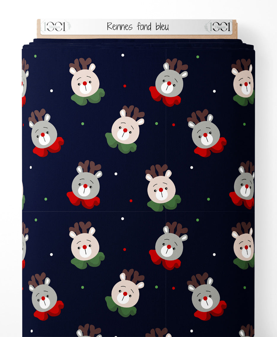 Les rennes portent des écharpes rouges et vertes. Le fond bleu marine est parsemé de petits points colorés. Les rennes ont des bois marron et des expressions variées.Les tissus